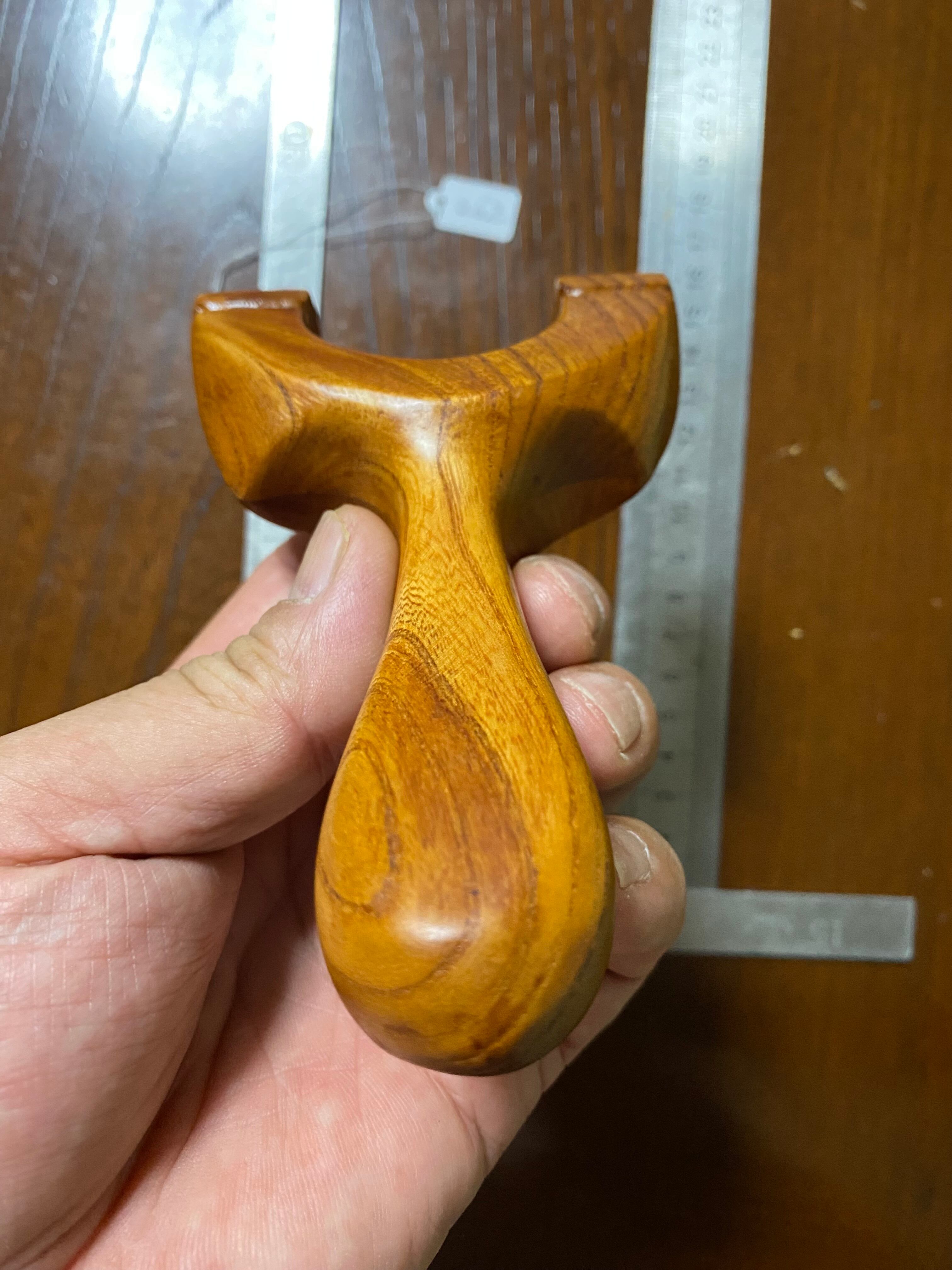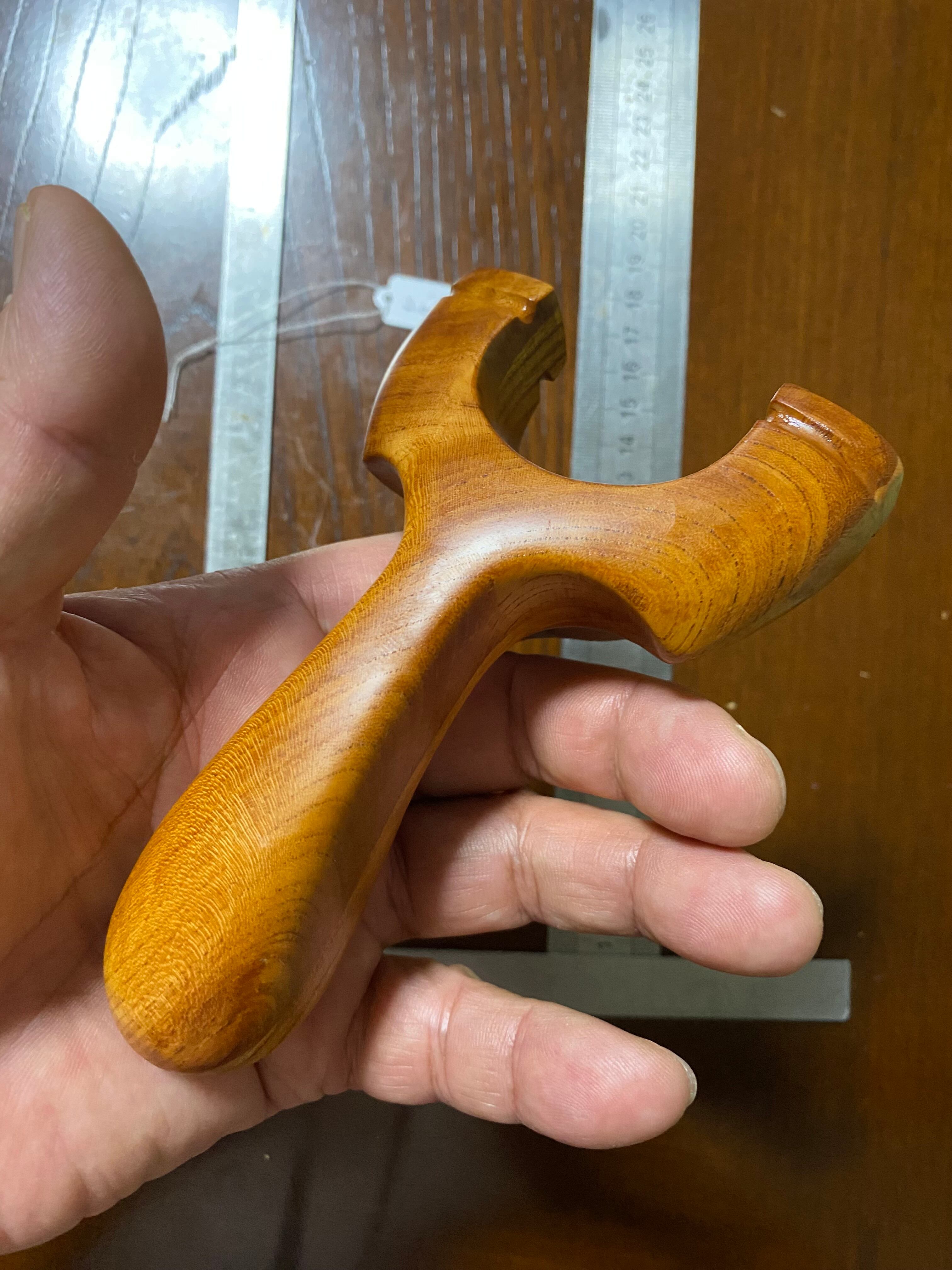 ヘッド持ちがしやすいようにハンドルの脇を深めにし、親指と人差し指を持つエリアを広めにしました。ケヤキの木目の綺麗なカッチリとした印象のスリングショットです。2枚の板を接合した事により、デザイン製の高い作品になっています。