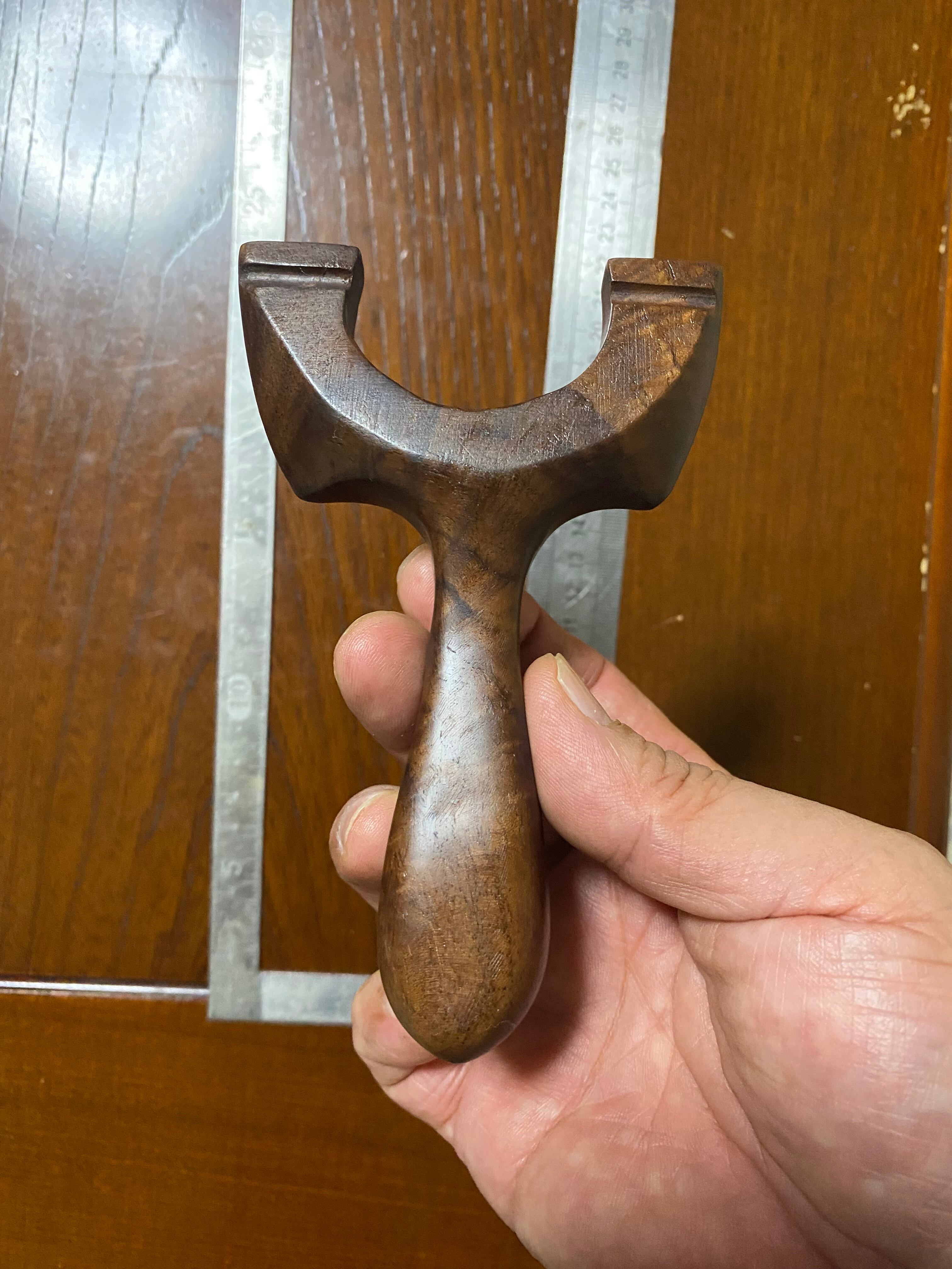 ヘッド持ちがしやすいようにハンドルの脇を深めにし、親指と人差し指を持つエリアを広めにしました。ウォールナットの綺麗な焦茶色でカッチリとした印象のスリングショットです。28mmの1枚板を使用し薄型ながらもデザイン製の高い作品になっています。