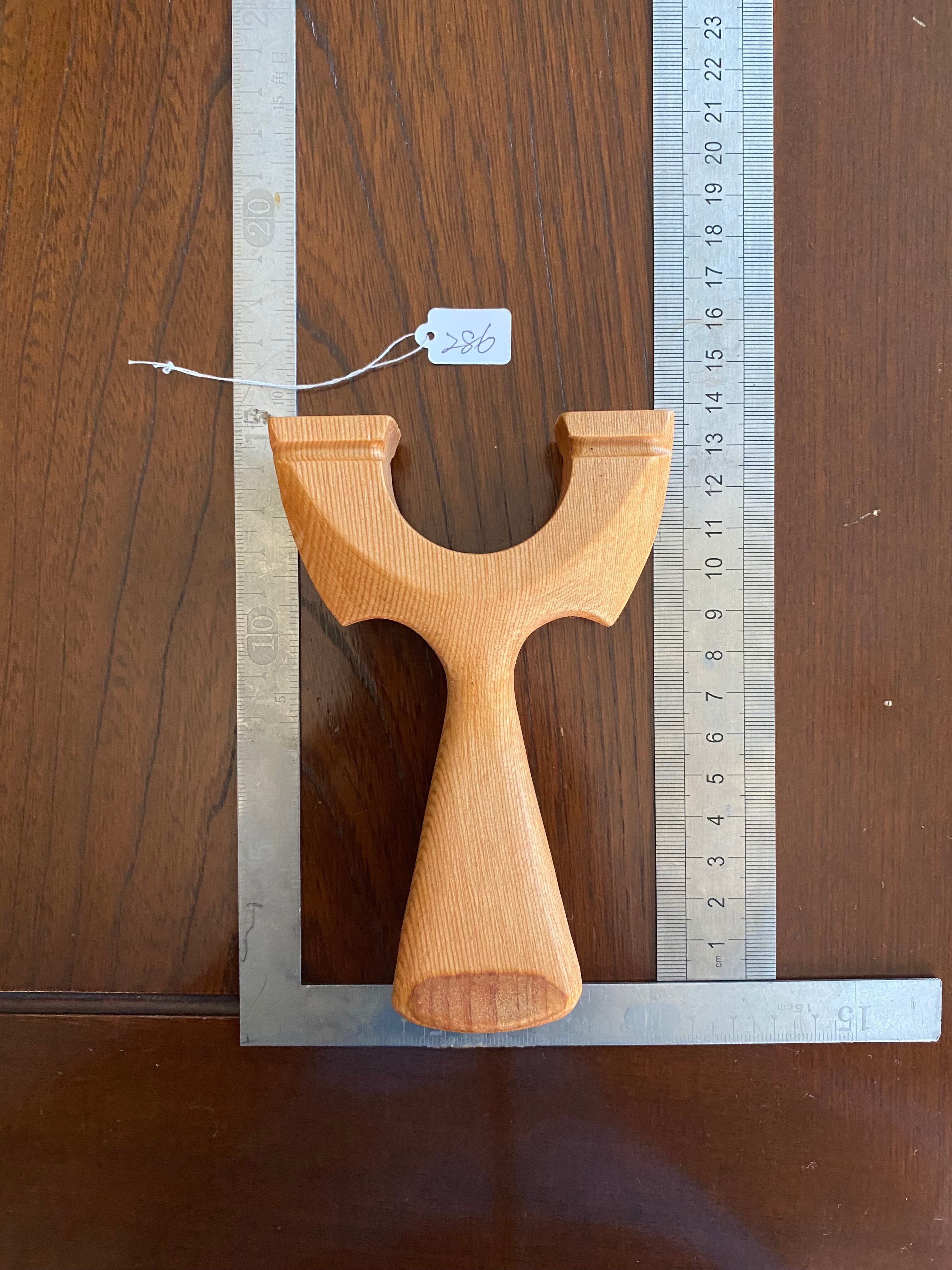 ヘッド持ちがしやすいようにハンドルの脇を深めにし、親指と人差し指を持つエリアを広めにしました。杉と思われる綺麗な木目でカッチリとした印象のスリングショットです。28mmの1枚板を使用し薄型ながらもデザイン製の高い作品になっています。ハンドルは扇型デザインです。
