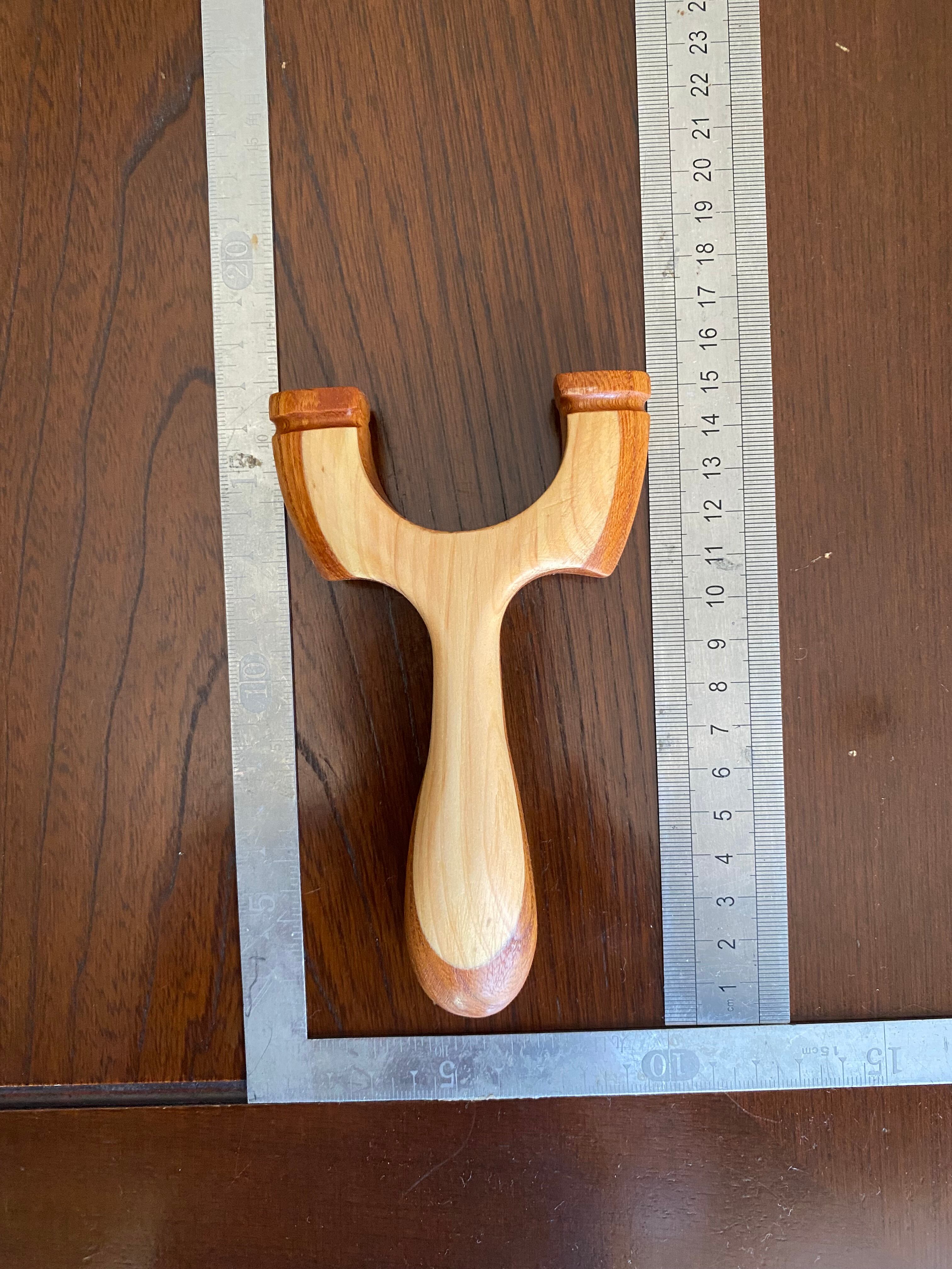 ヘッド持ちがしやすいようにハンドルの脇を深めにし、親指と人差し指を持つエリアを広めにしました。23mm厚の欅と5mmの白木を合わせたコンビカラーのスリングショットです。欅の部材2つを合わせた薄型ながらもデザイン製の高い作品になっています。