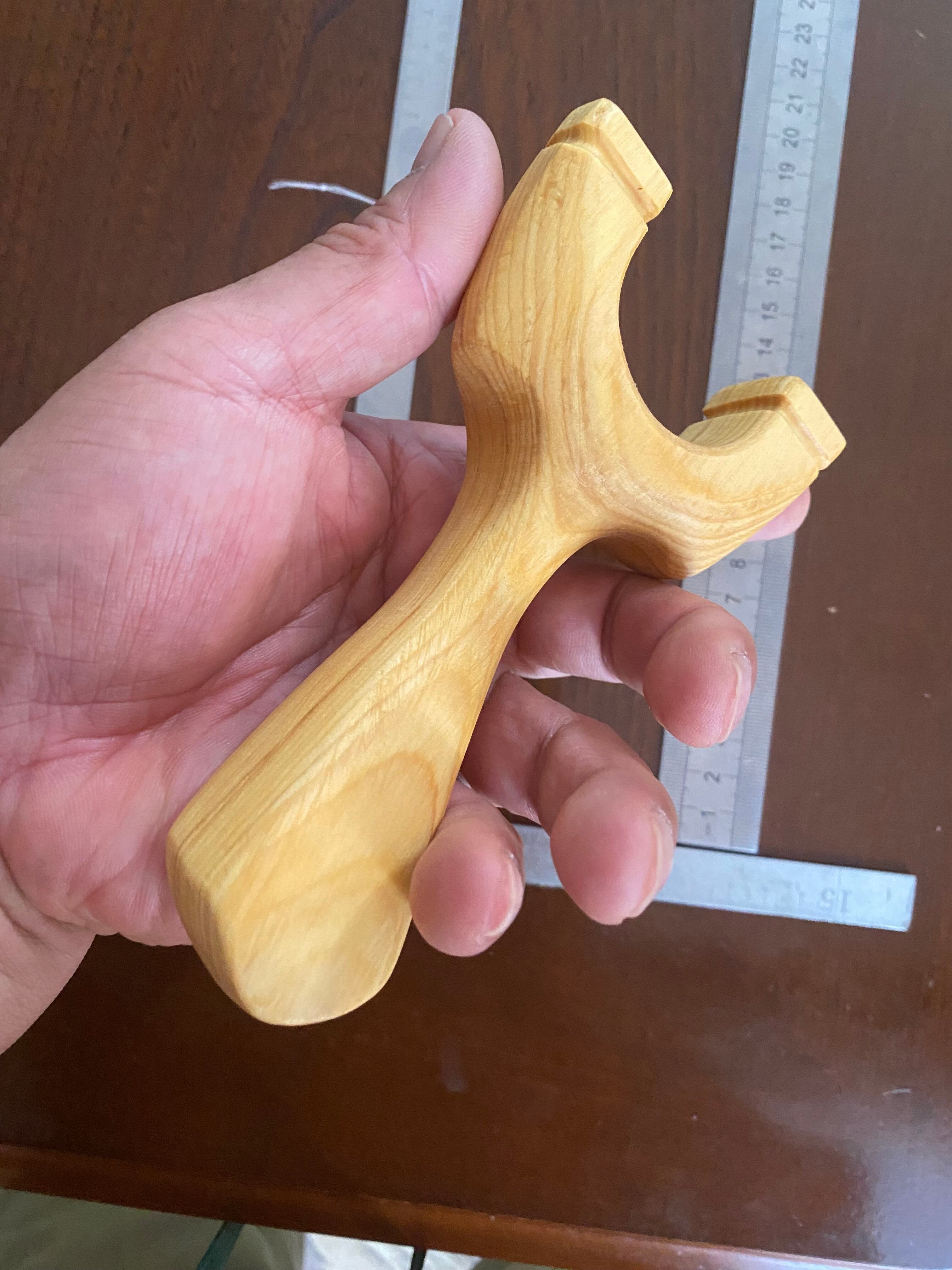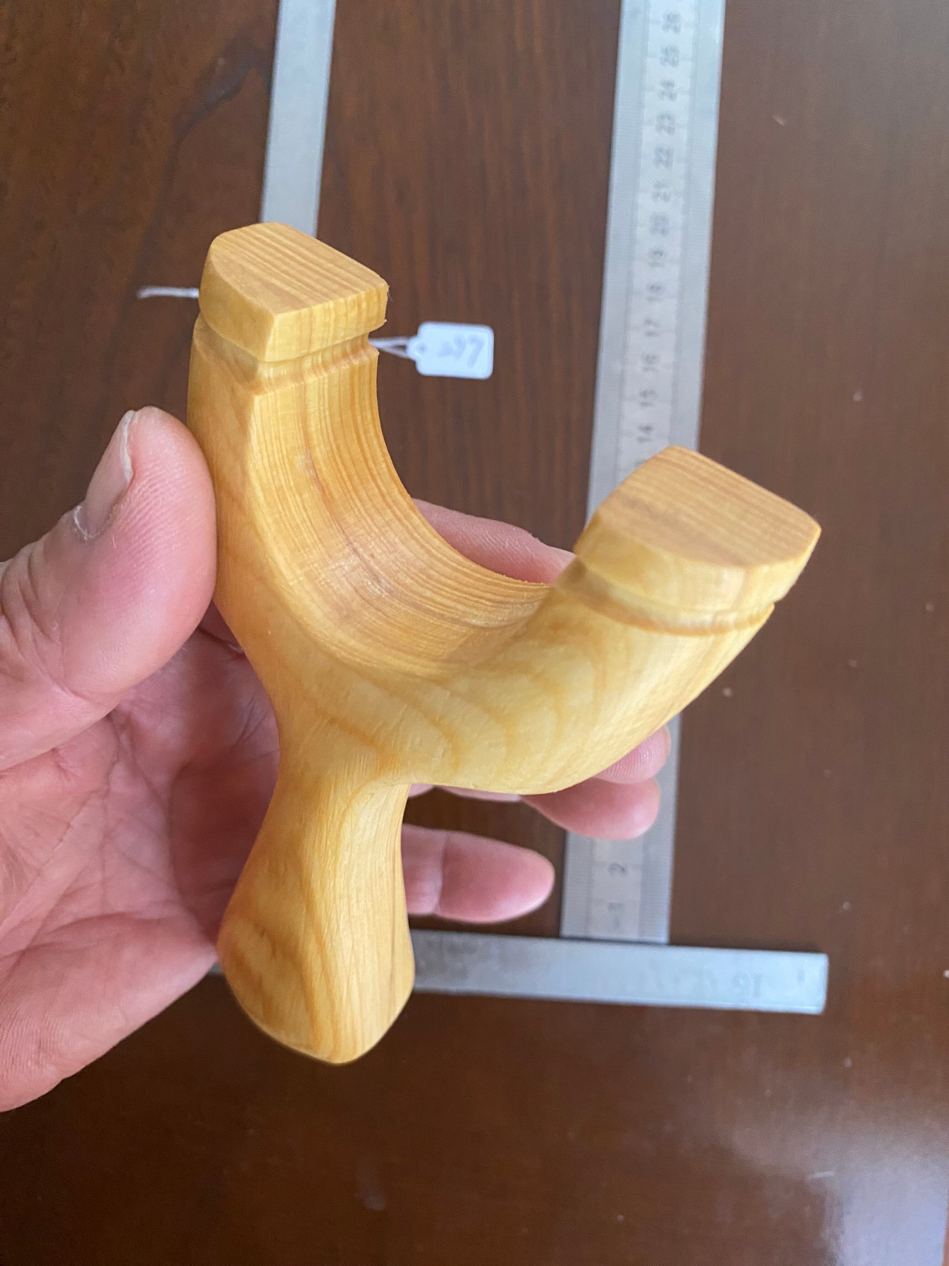 ヘッド持ちがしやすいようにハンドルの脇を深めにし、親指と人差し指を持つエリアを広めにしました。白木材でソフトな印象のスリングショットです。15mmの無垢材を2枚貼り合わせたものをアーチ状に整形し、デザイン製の高い作品になっています。ハンドルは丸扇型デザインです。
