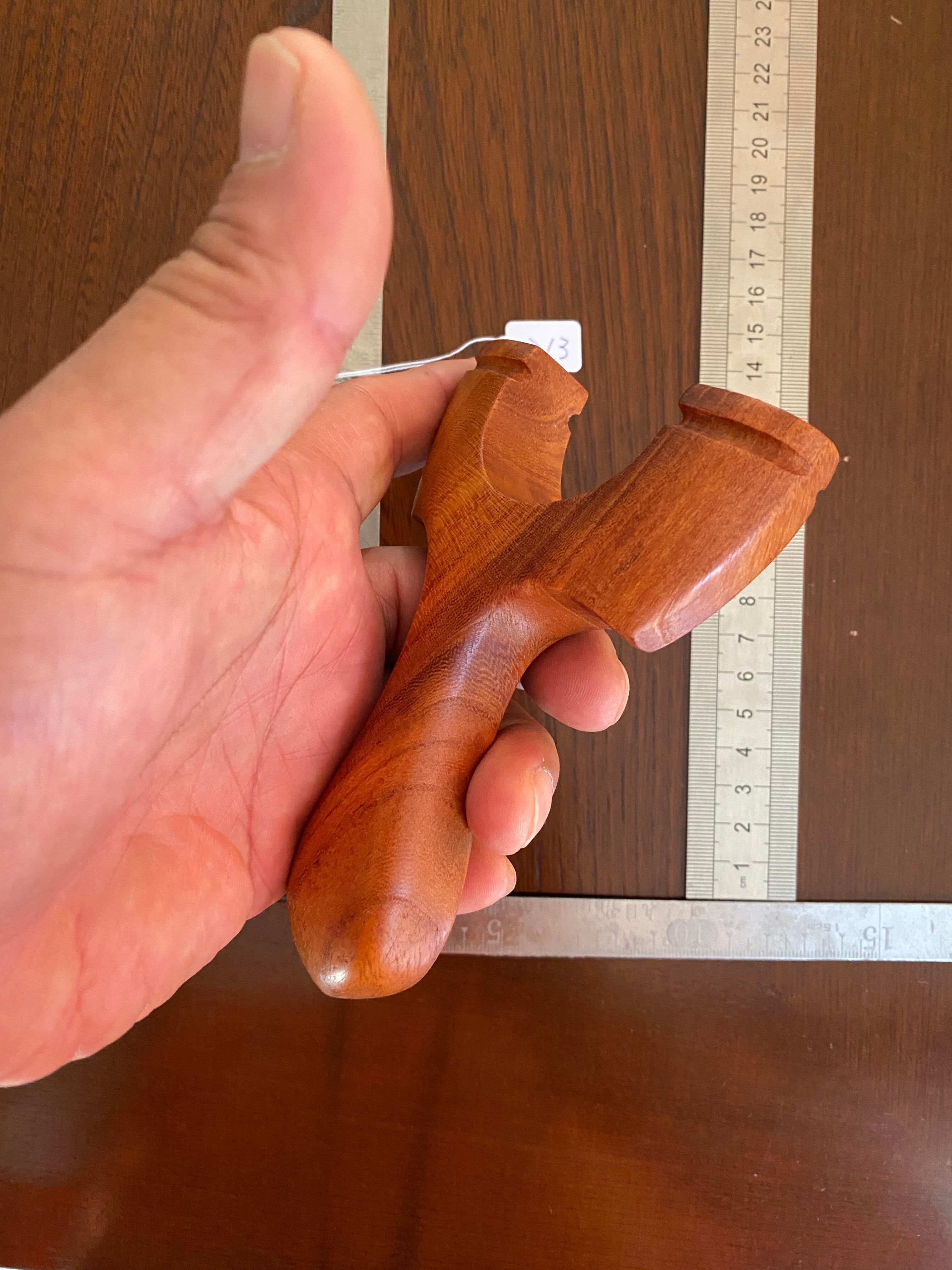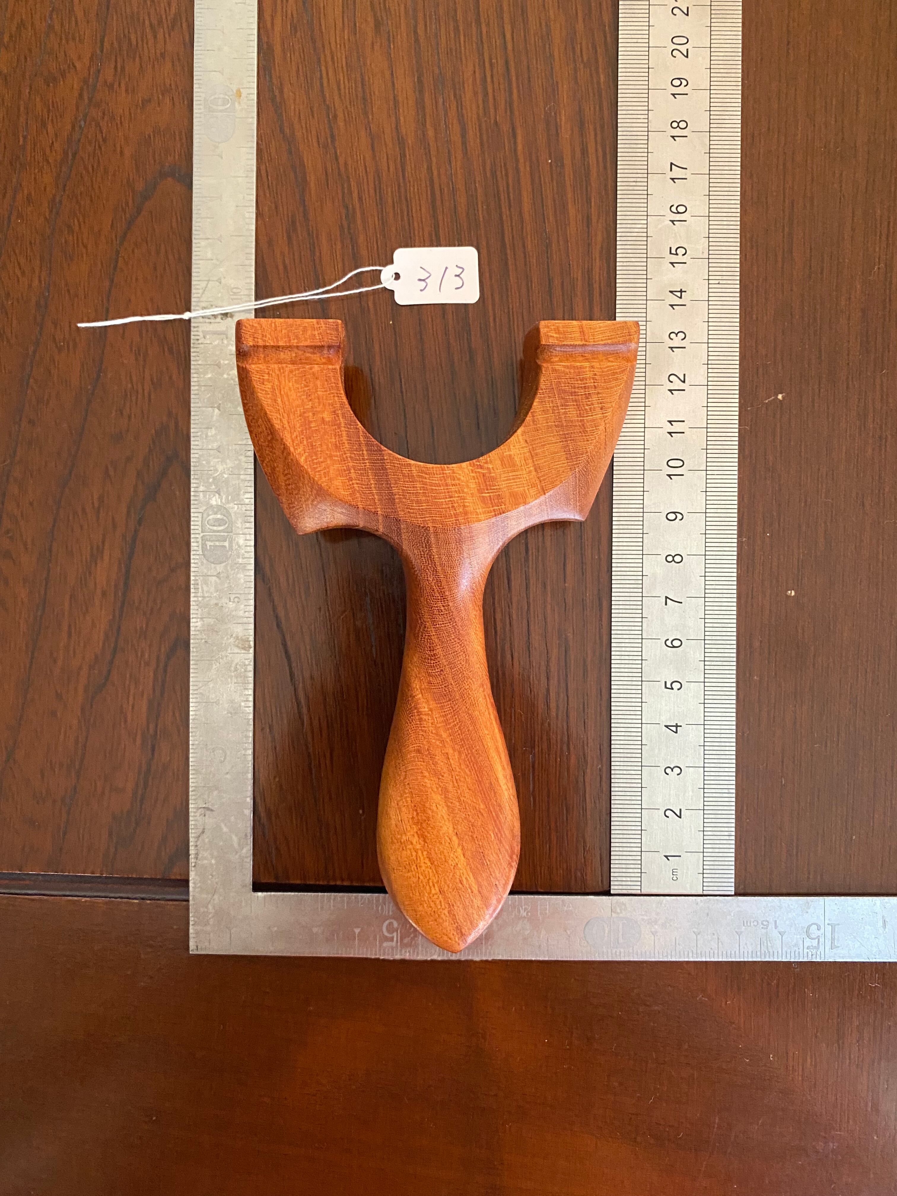 ヘッド持ちがしやすいようにハンドルの脇を深めにし、親指と人差し指を持つエリアを広めにしました。33mm厚の欅の無垢材から切り出した贅沢なスリングショットです。欅の木目を生かしたデザイン製の高い作品になっています。ハンドルエンドは尖りデザインです。