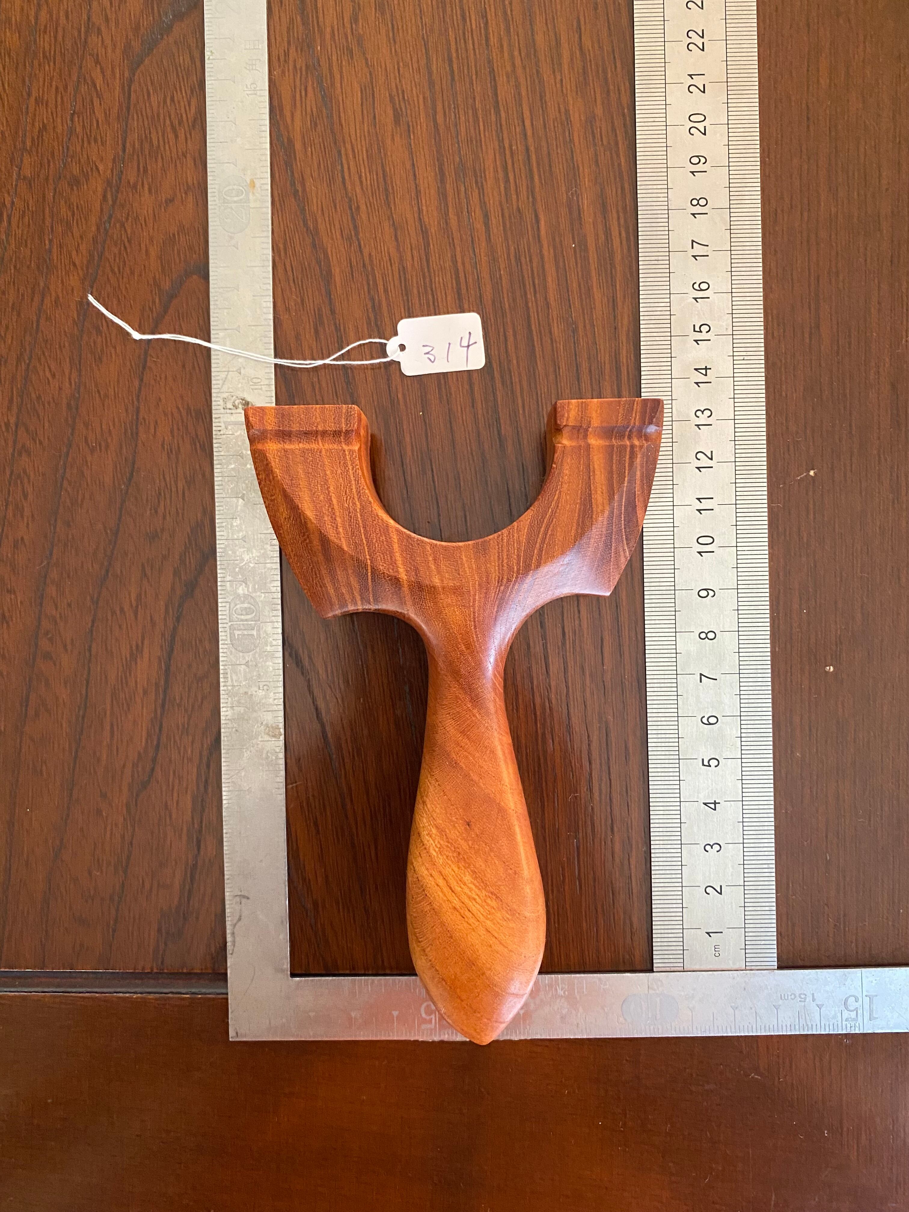 ヘッド持ちがしやすいようにハンドルの脇を深めにし、親指と人差し指を持つエリアを広めにしました。33mm厚の欅の無垢材から切り出した贅沢なスリングショットです。欅の木目を生かしたデザイン製の高い作品になっています。ハンドルエンドは尖りデザインです。
