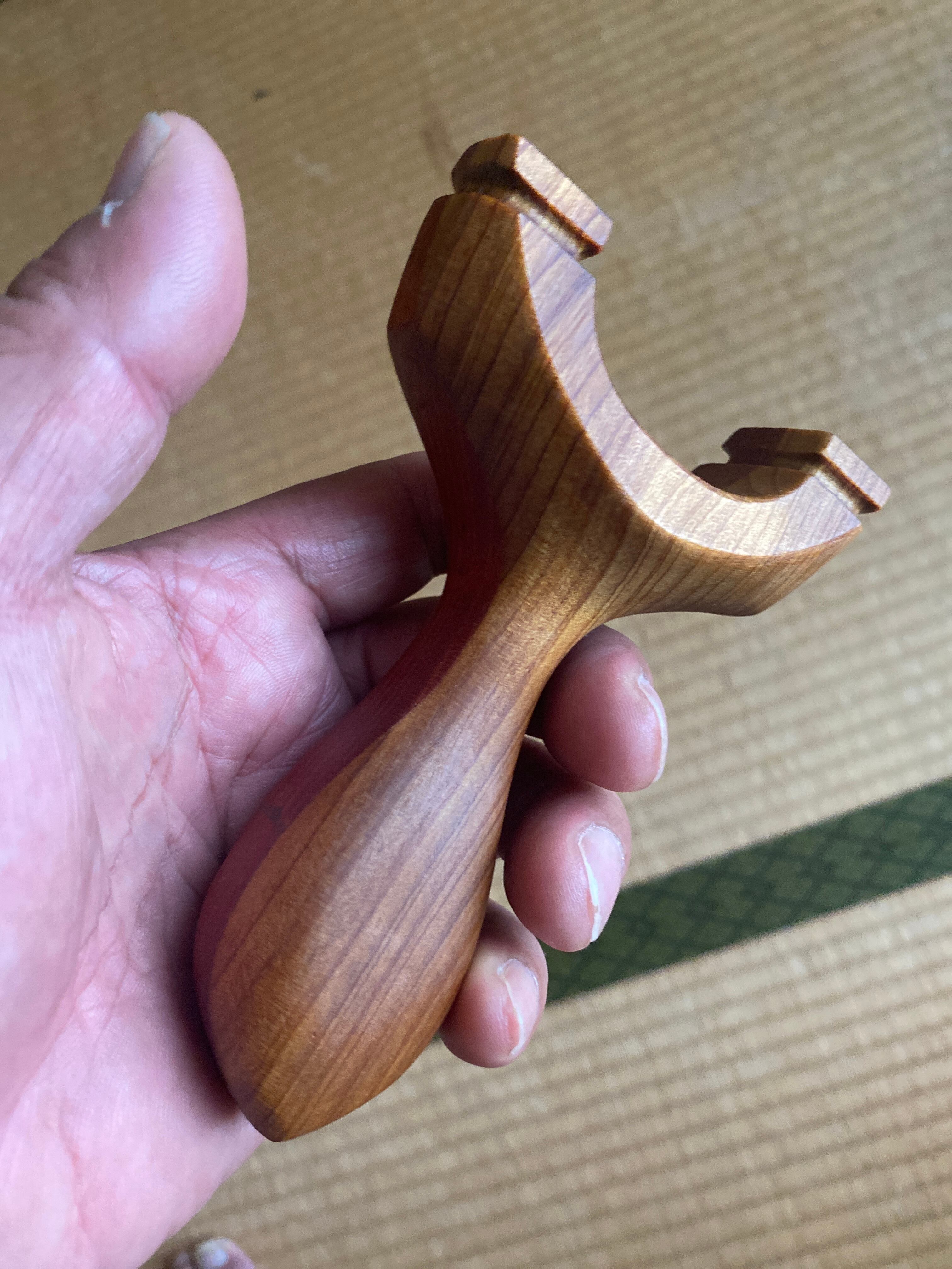 強くて硬いケヤキを贅沢に使い、無駄なところを削ぎ落としたデザインのスリングショットです。ハンドルはすっぽ抜け防止と共に握った時の本体固定に効力を発揮します。タカのような鋭い攻撃力を持つイメージの作品です。