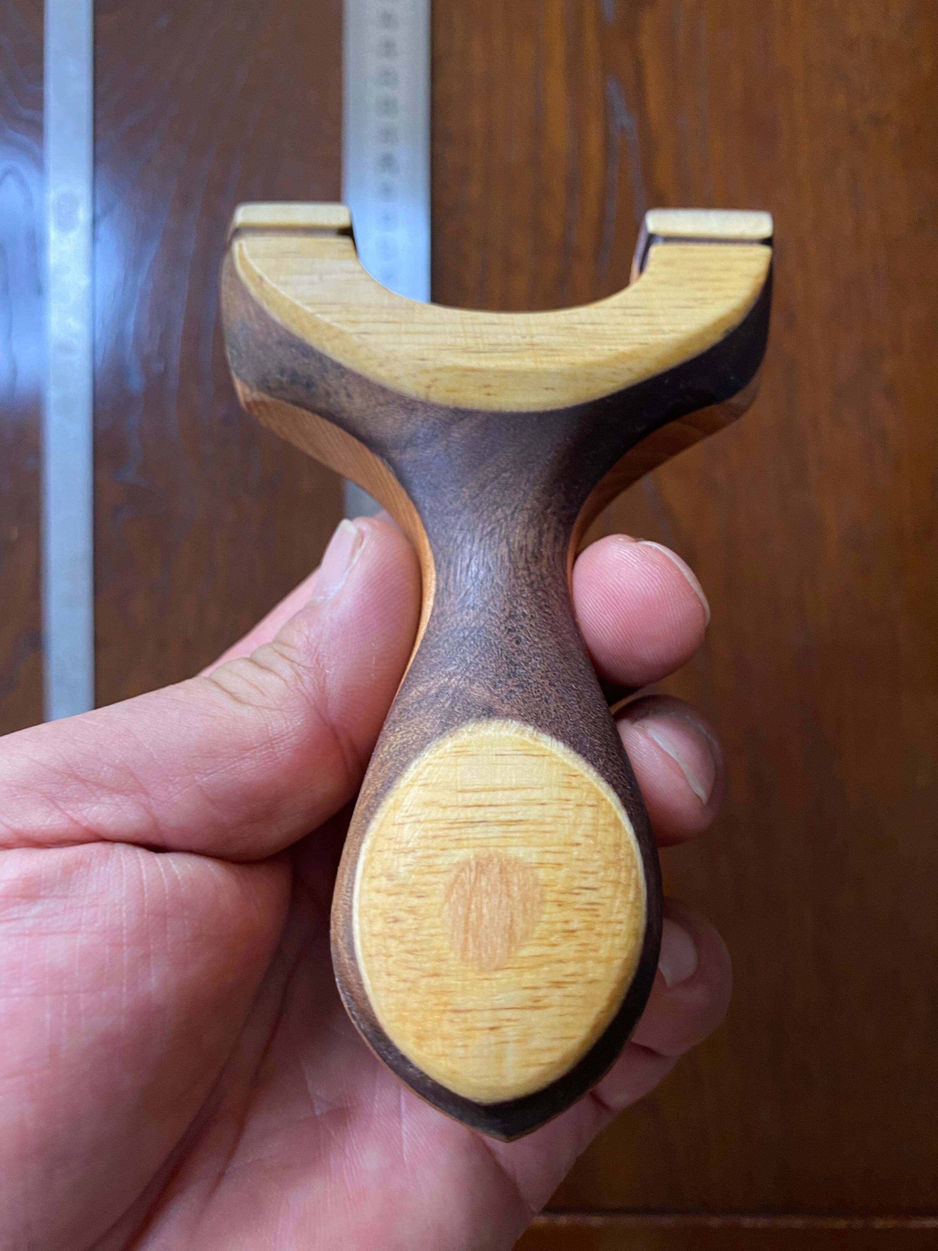 強くて硬いウォールナットと白木を積み重ねた材料を使い、無駄なところを削ぎ落としたデザインのスリングショットです。ハンドルはすっぽ抜け防止と共に握った時の本体固定に効力を発揮します。タカのような鋭い攻撃力を持つイメージの作品です。