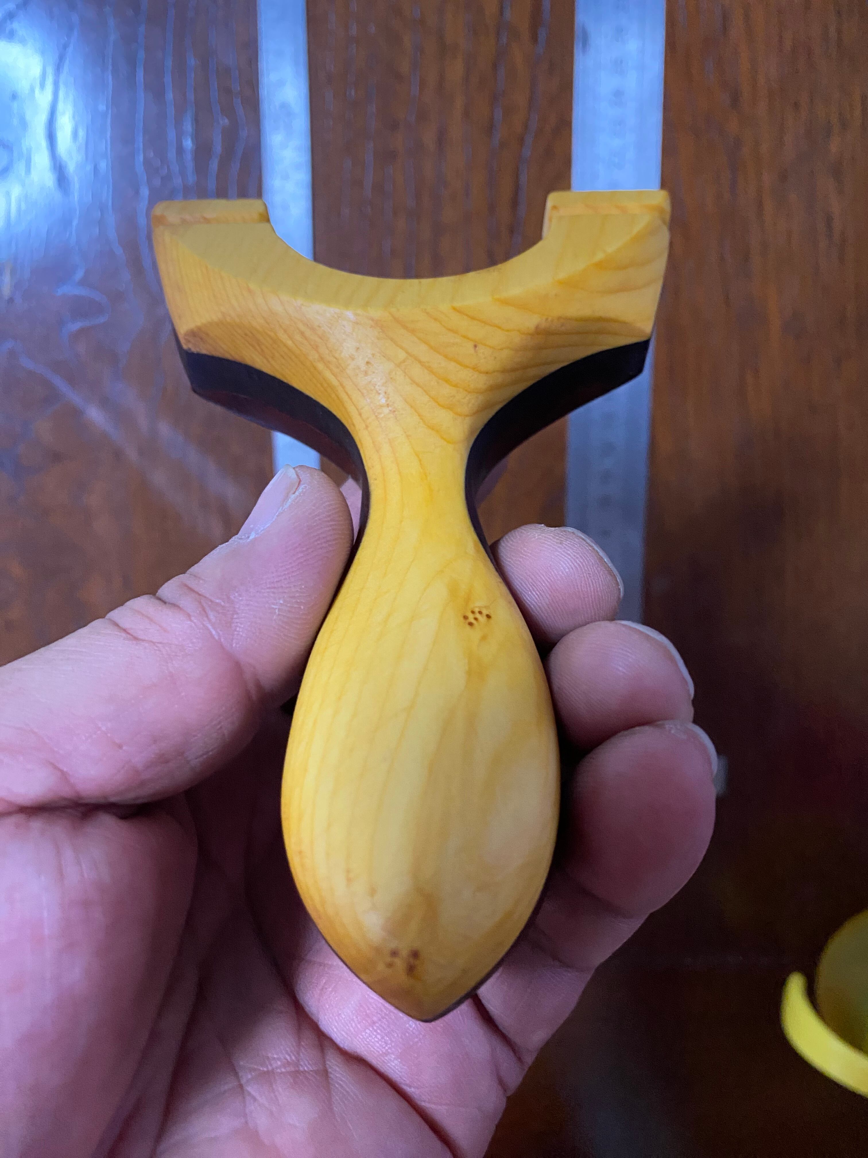 強くて硬い赤茶色の木とウォールナットと白木を積み重ねた材料を使い、無駄なところを削ぎ落としたデザインのスリングショットです。ハンドルはすっぽ抜け防止と共に握った時の本体固定に効力を発揮します。タカのような鋭い攻撃力を持つイメージの作品です。