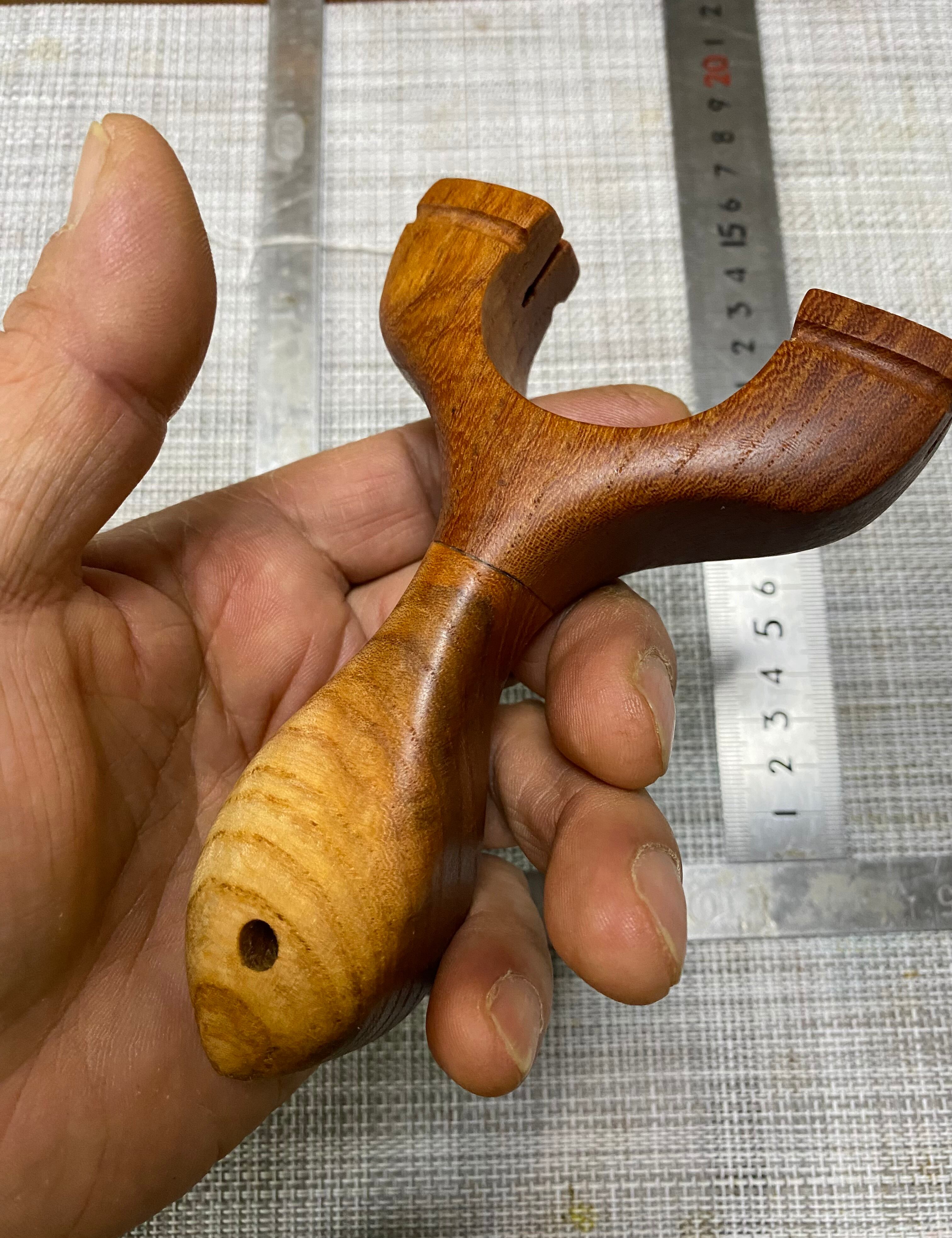 ケヤキの赤身の部分と白身の部分を補強のため竹ダボ継ぎしたカラフルなデザインのスリングショットです。欅の木目に合わせて切り出した貴重なHawk2の肘の角を丸めたオーソドックスなデザイン。欅の無垢材の2部材を使用し、丸味のあるハンドルながらすっぽ抜けを防止する丸ハンドル仕様となっています。さらに、平ゴムの取り付け方法はゴム巻き方式とTOPSLOT方式の2wayが可能です。二つの部材をダボ継がしたスリングショットです。