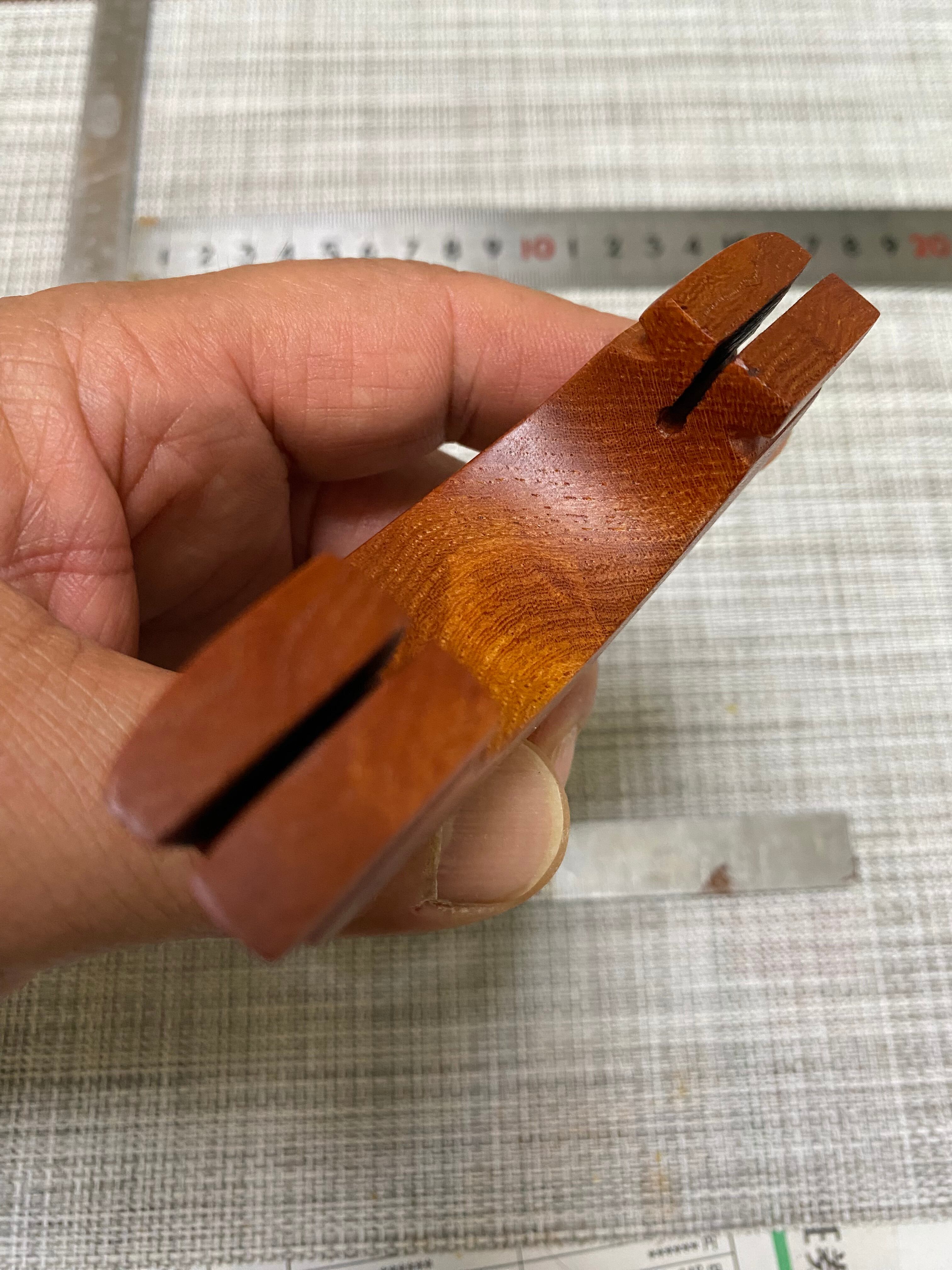 この商品は、硬い欅の無垢材からの削り出しで、#1500まで磨き込んだ逸品です。珍しい欅の杢目の上質な風合いとスッキリしたスタイルは使い心地に一層の高級感をプラスしています。表面処理は亜麻仁油浸潤の後蜜蝋を塗り仕上げています。