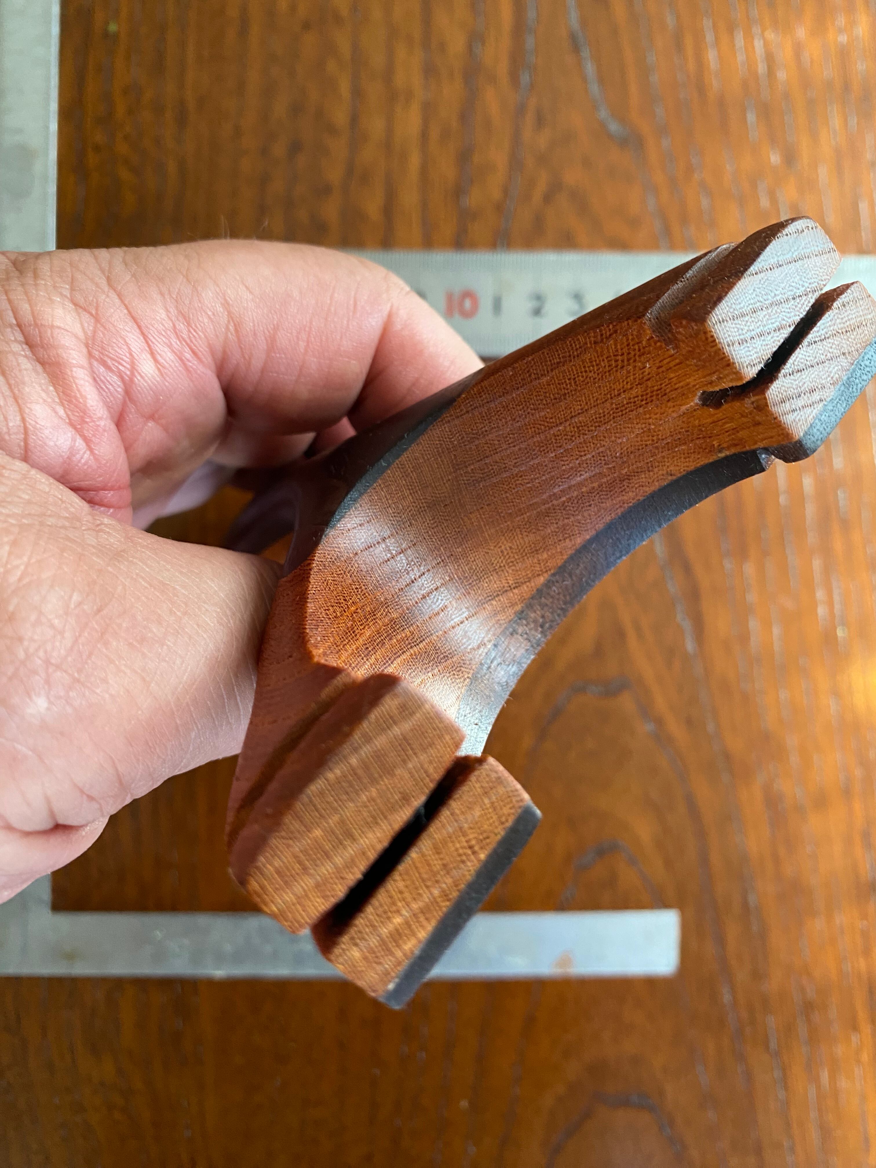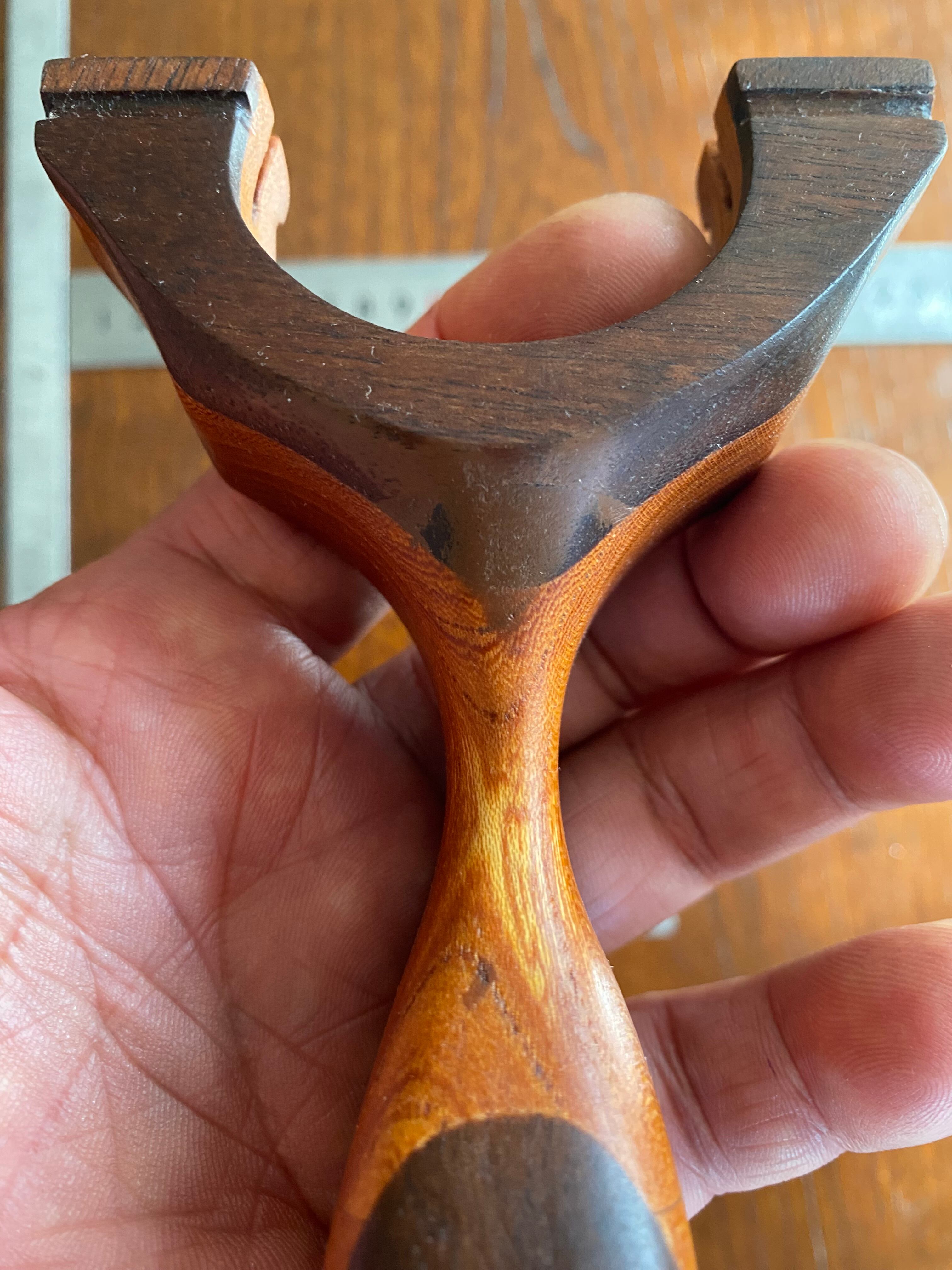 ケヤキと黒檀を贅沢に組み合わせたNo.502 スリムスリングショット(ハンドル太改)。持ち手の太さが改良されたこの作品は、手にしっかりフィットしやすいのが特徴です。手首に負担をかけずに、狙いを定確に捉えることができる優れものです。