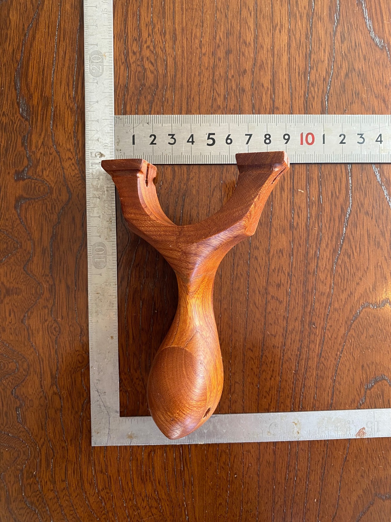 ケヤキと赤欅を贅沢に組み合わせたNo.503 スリムスリングショット(ハンドル太・フォーク細に改)。持ち手の太さが改良されたこの作品は、手にしっかりフィットしやすいのが特徴です。手首に負担をかけずに、狙いを定確に捉えることができる優れものです。