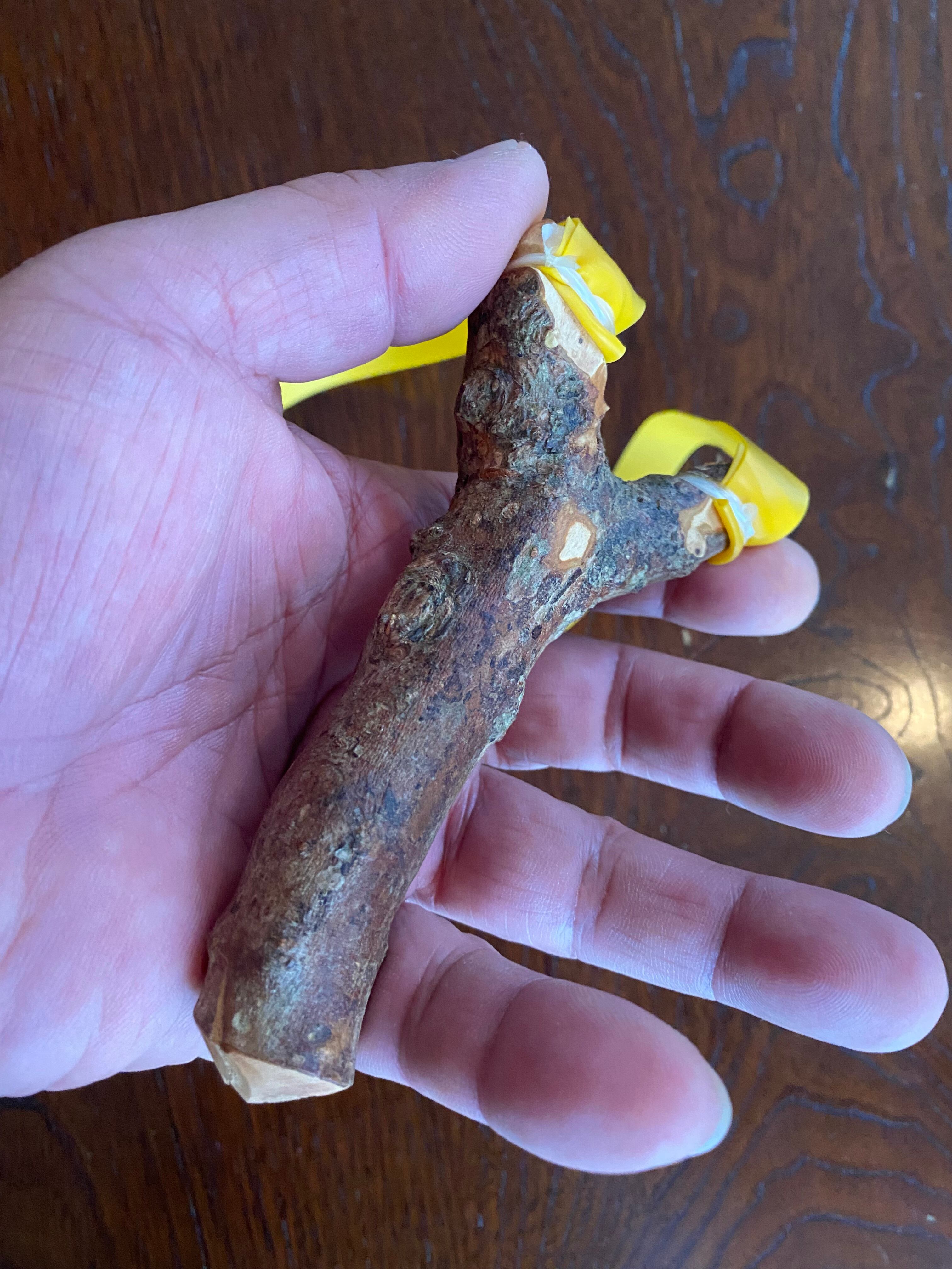 カイヅカイブキの細めの枝で作った小型スリングショットです。