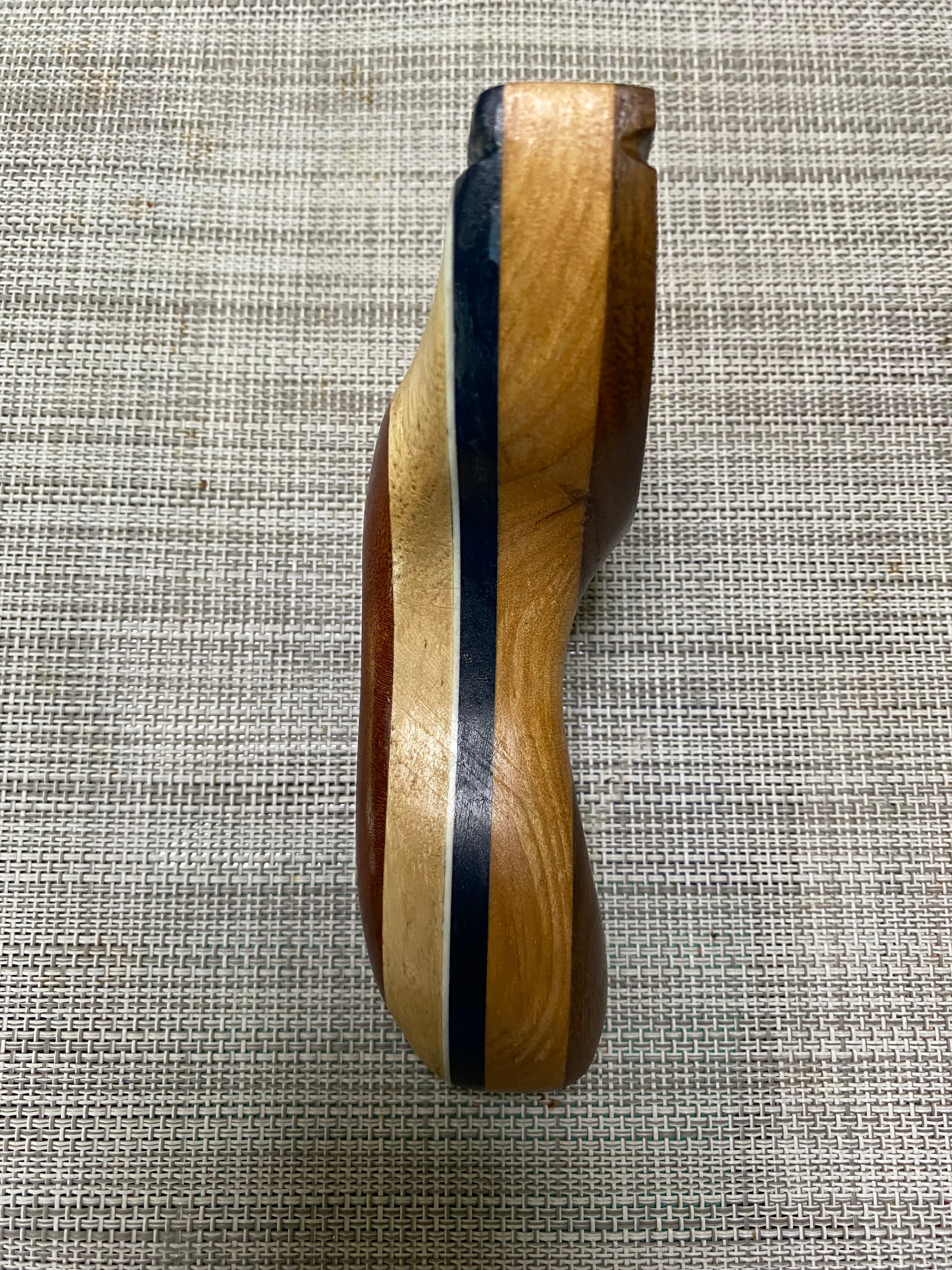 No.560 Identity 庵野吽 ゴム巻き式はNo.509丸ゴム1632 自動弾出し早撃ち仕様の外見的な積層模様を取り入れた派生作品です。塗装は木固めエースで表面を強化したのちに防水塗装をしてより光沢が出るように加工を施した物です。
