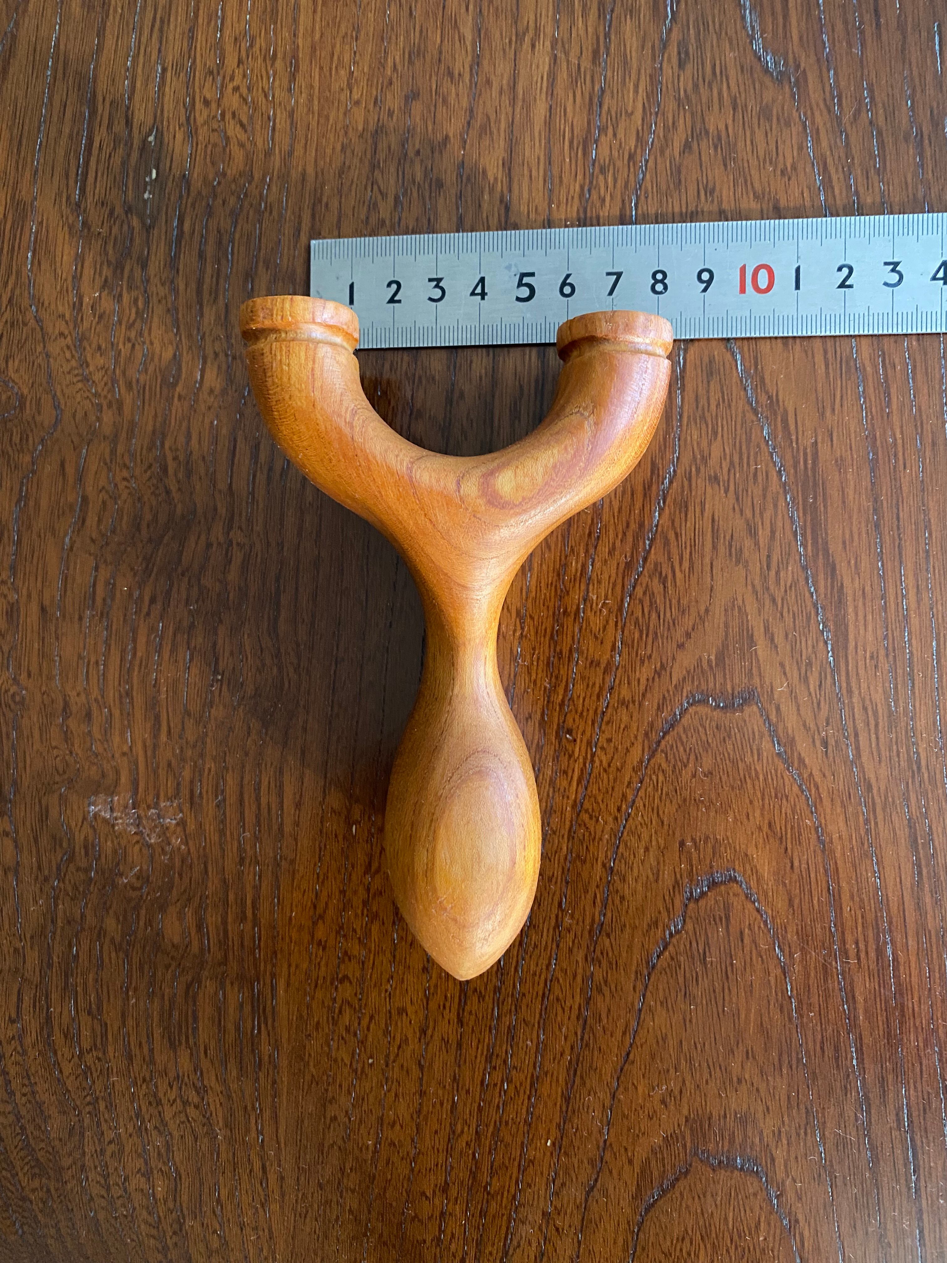 45mmの厚い欅板から削り出したNo.571 Identity庵野吽(欅製)丸ヘッドタイプのスリングショット。裏に回した指がすっぽり入る反りが握りの安定感を生み出しています。丁寧な手作りにより、一つ一つ異なる風合いを持ち、手にした瞬間にその素材の高級感が伝わってきます。