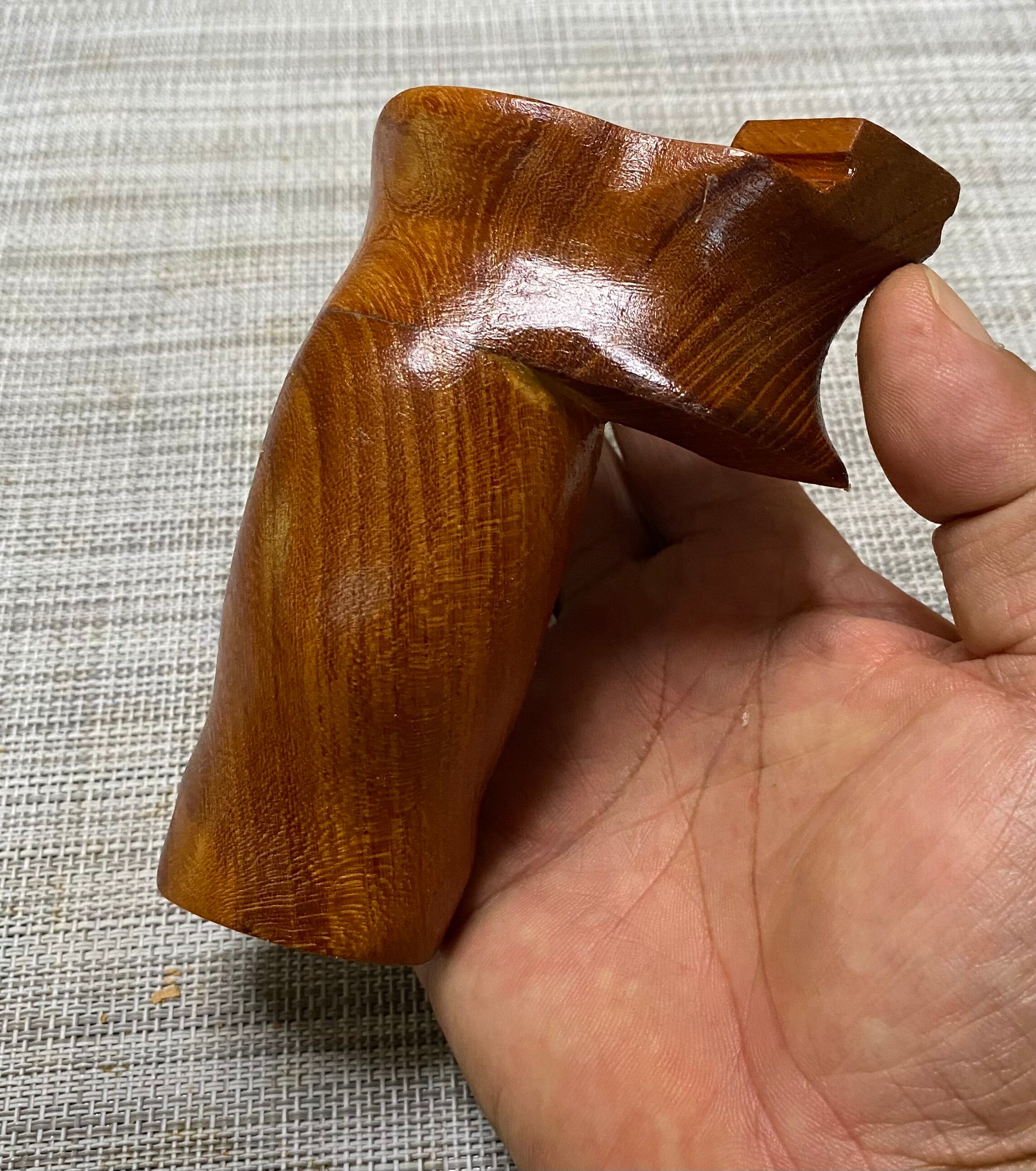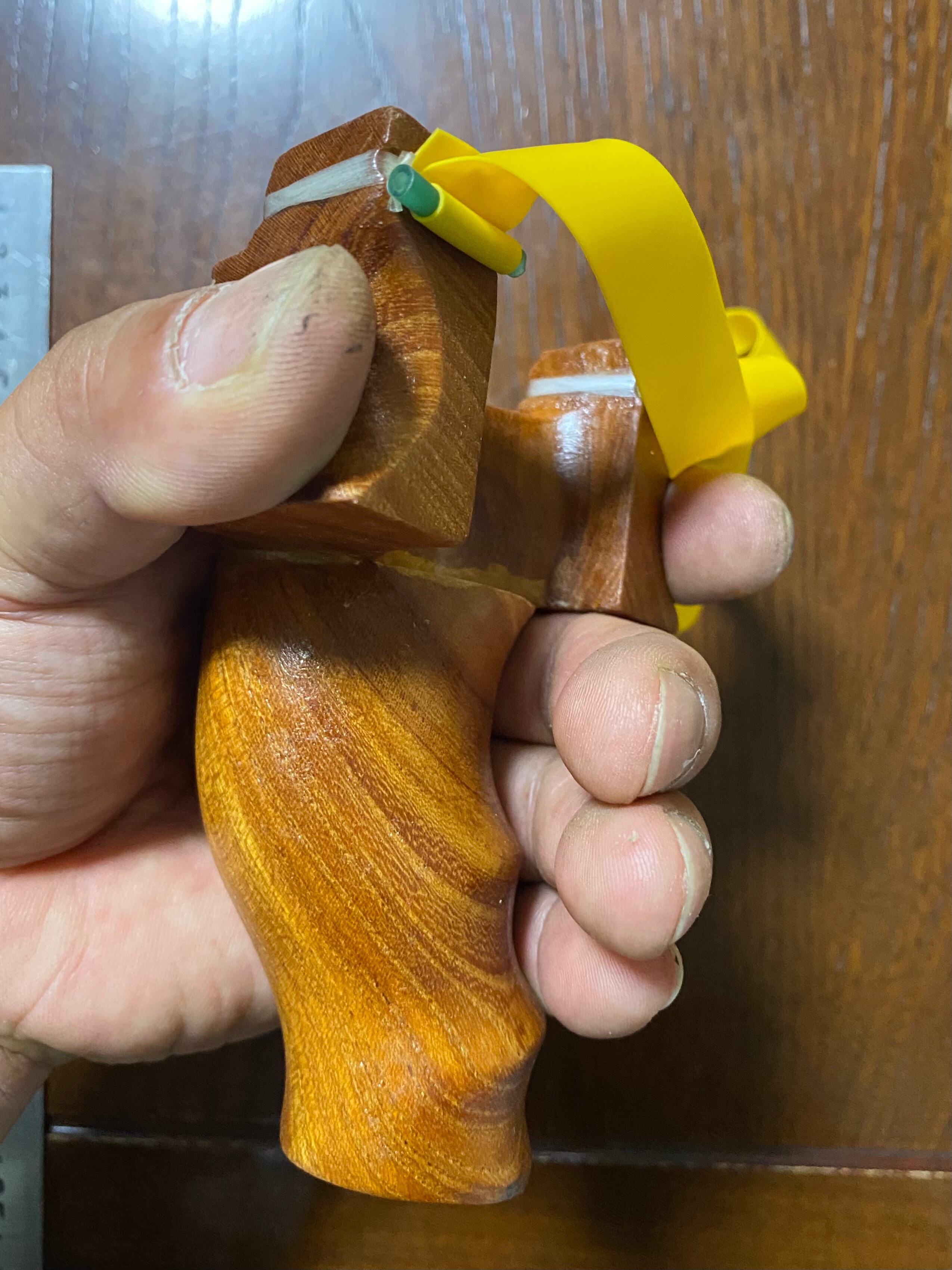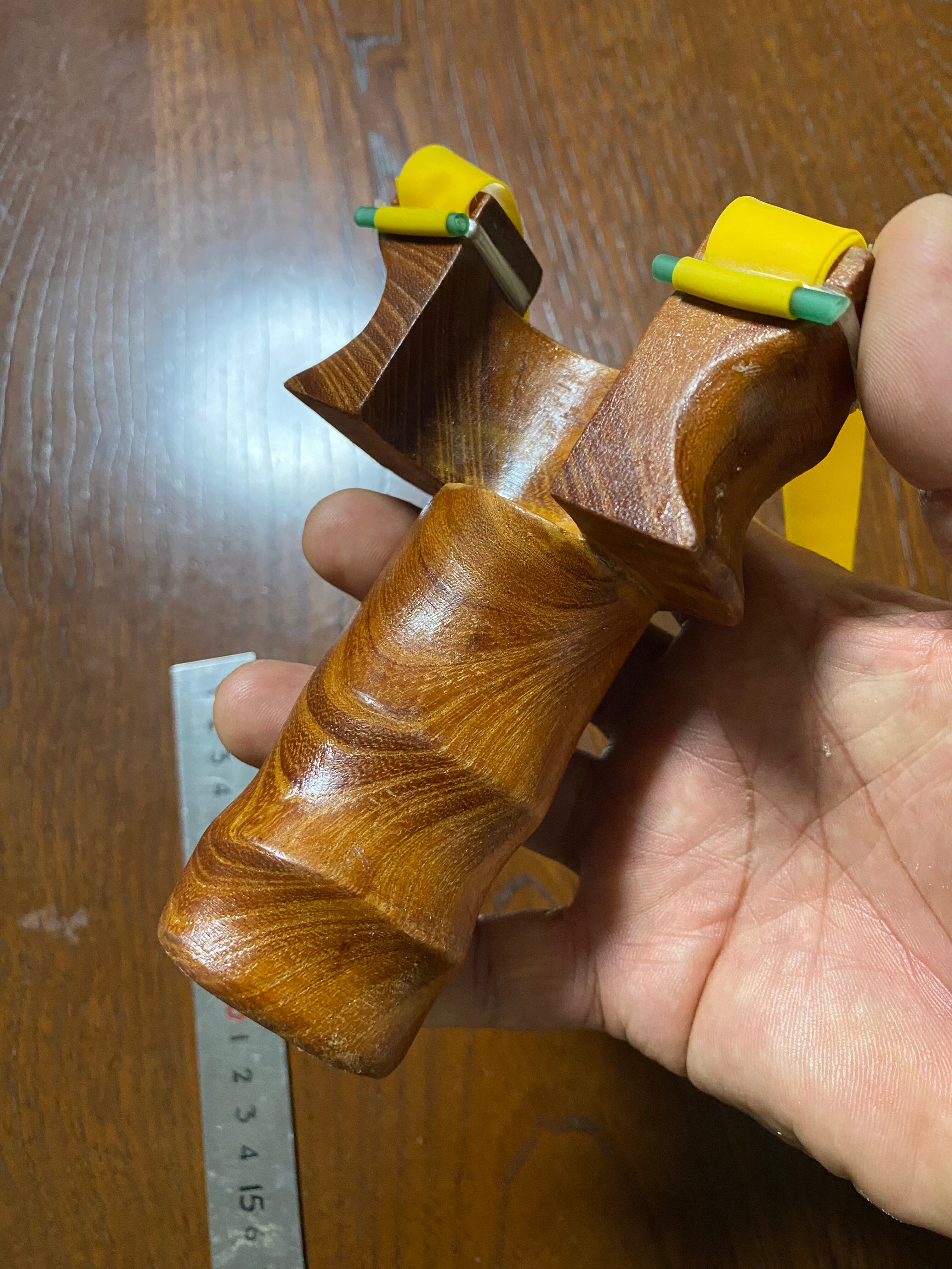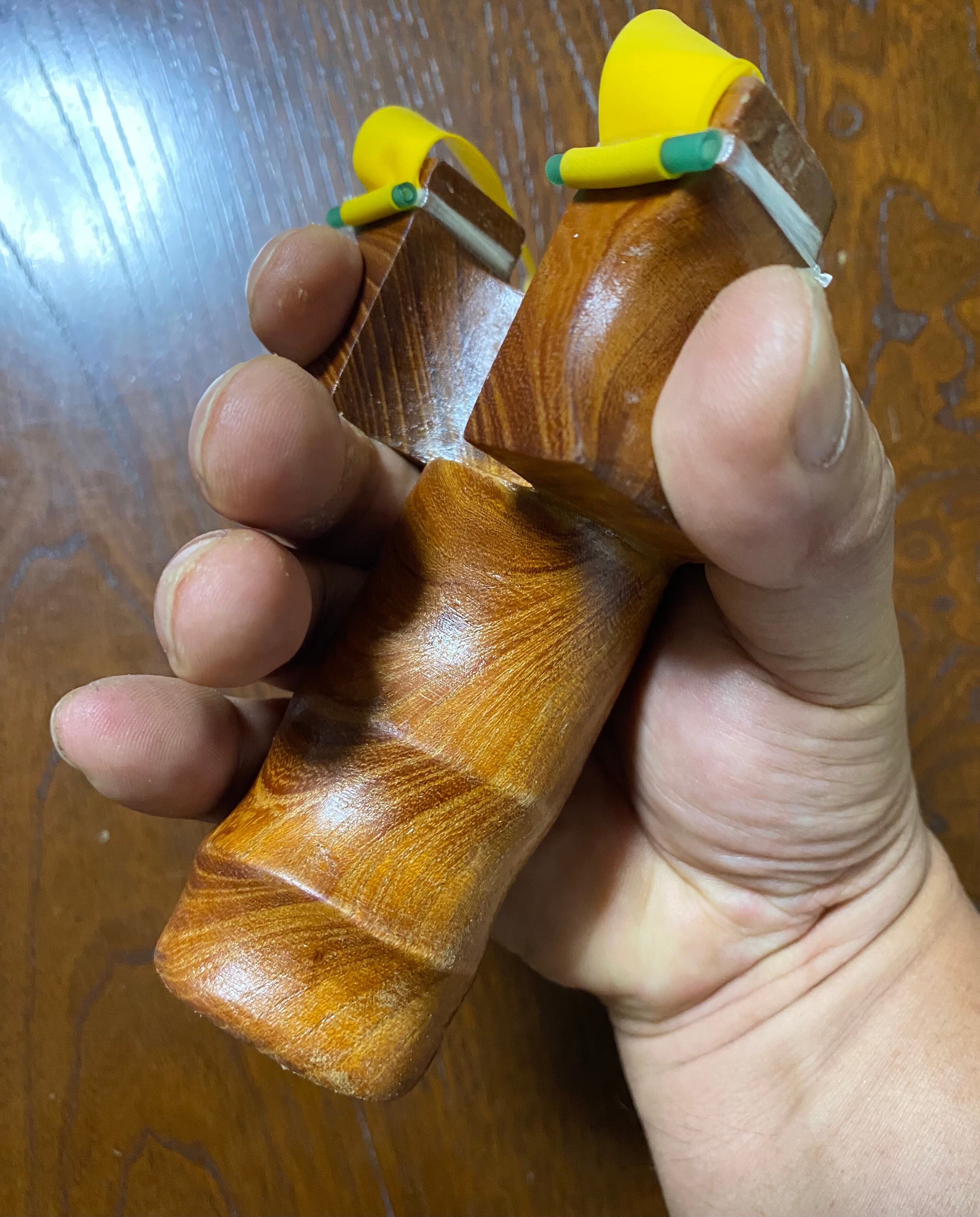握った手にフィットしやすい特殊な形状のNo.573は、ウチワエビのような前屈みスタイルが特徴的なスリングショットです。欅の2部材を接着剤と5.5mmの竹2本で補強しており、しっかりとした握り心地を実現しています。右利きの方、左利きの方、どちらでも快適にご使用いただけます。