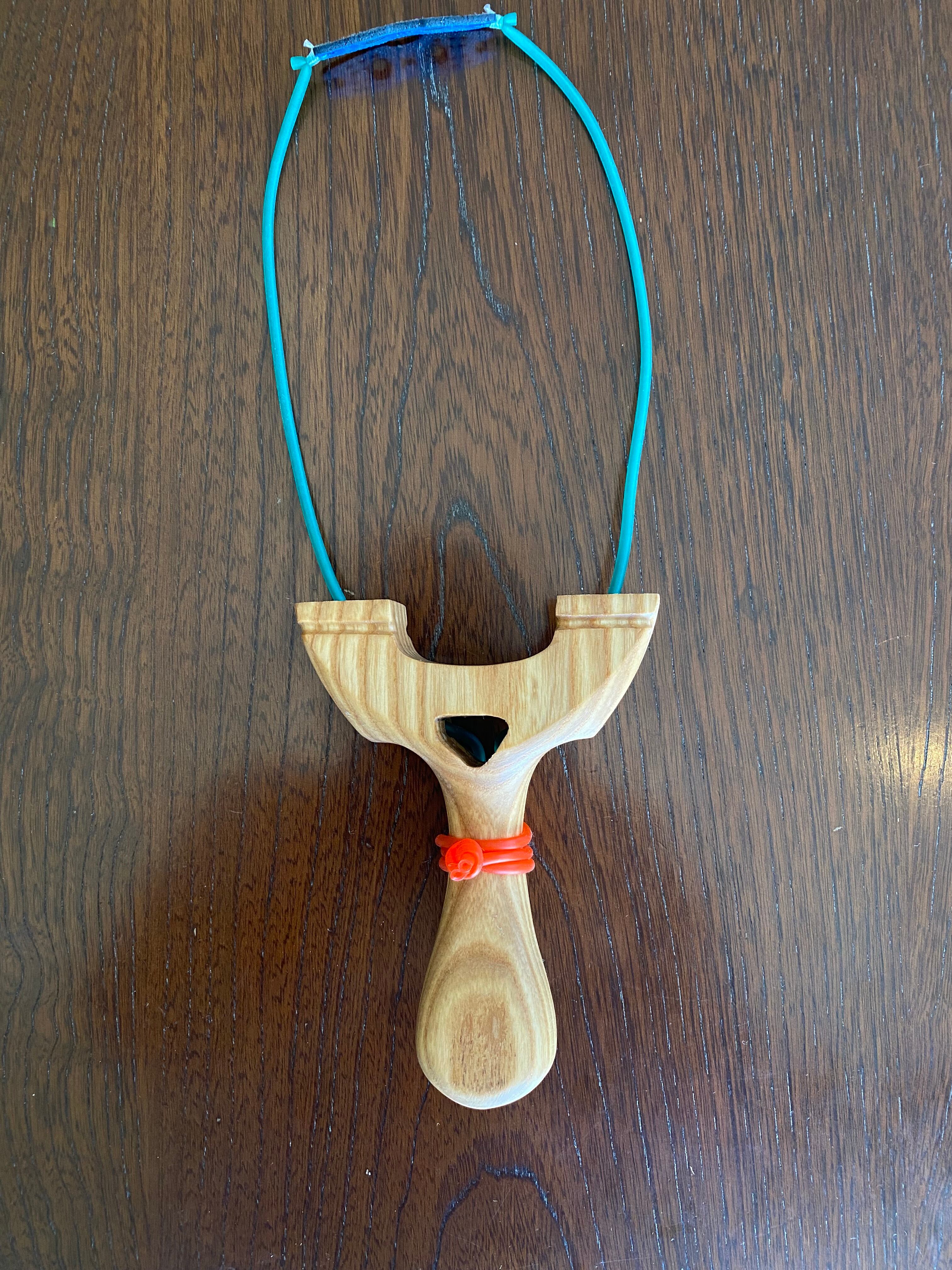 フォークとアーチの直近に丸ゴム管を通したスリングショットです。比較的簡単にゴム交換が可能なようにゴムをカーブさせるところに「窓」を設けました。