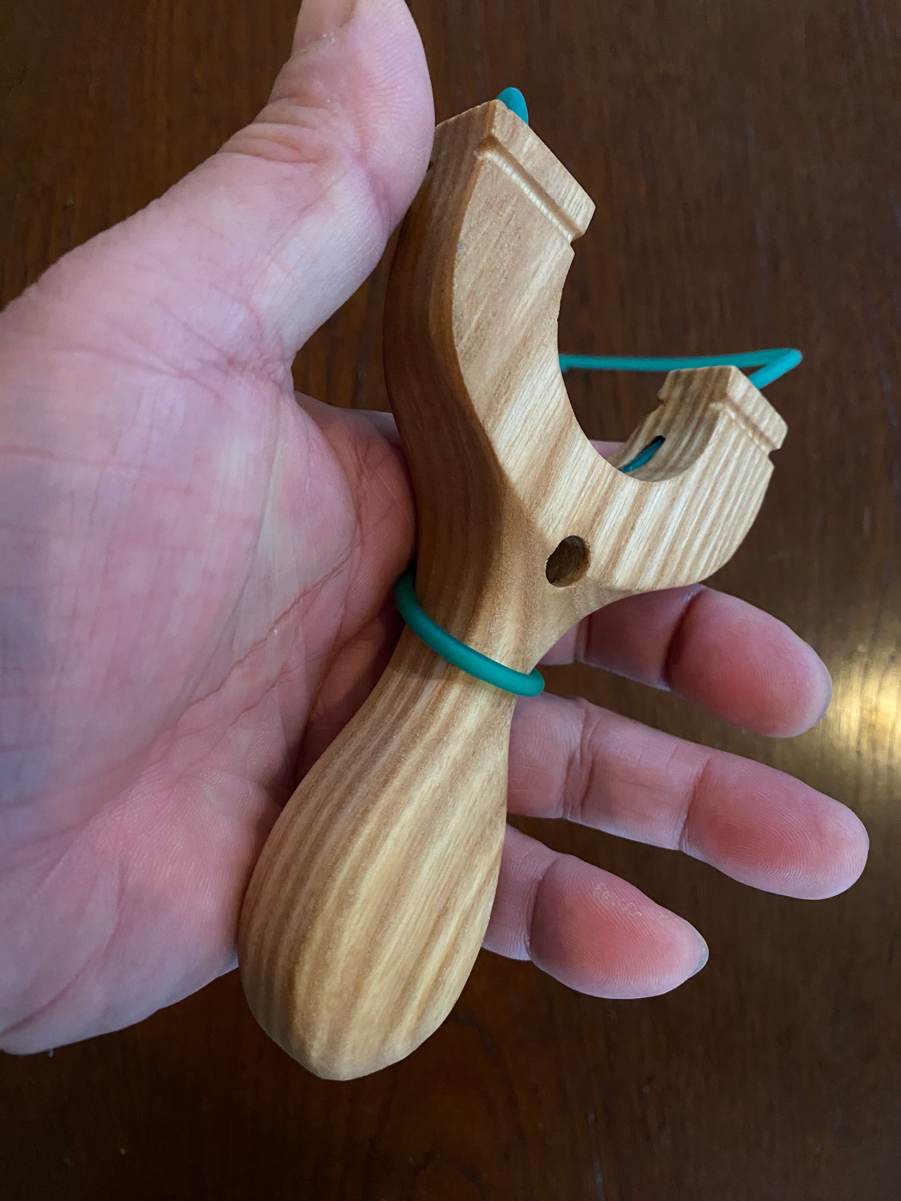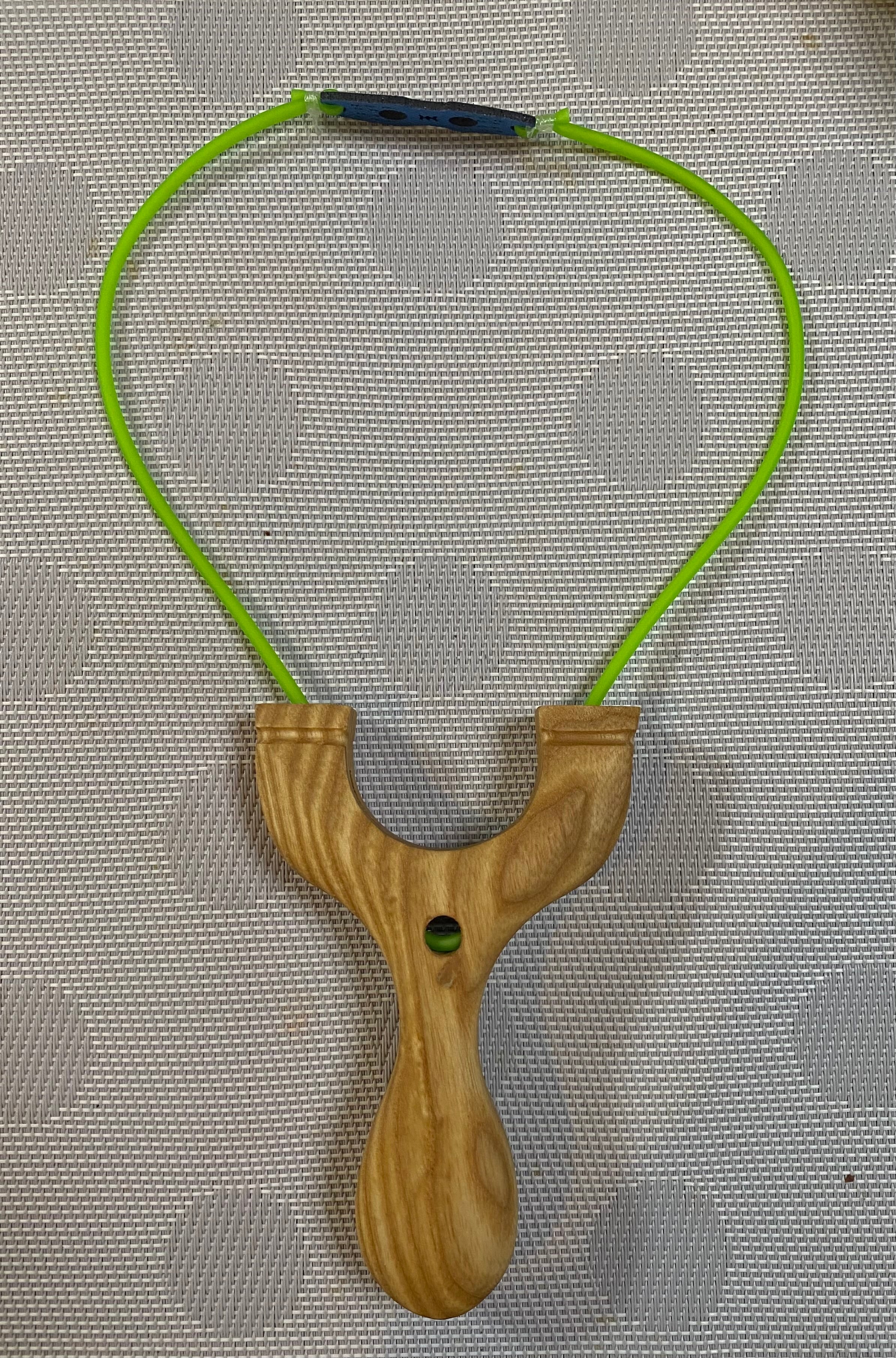 フォークの中を通した簡易版の早撃ちスリングショットです。フォークは長めです。