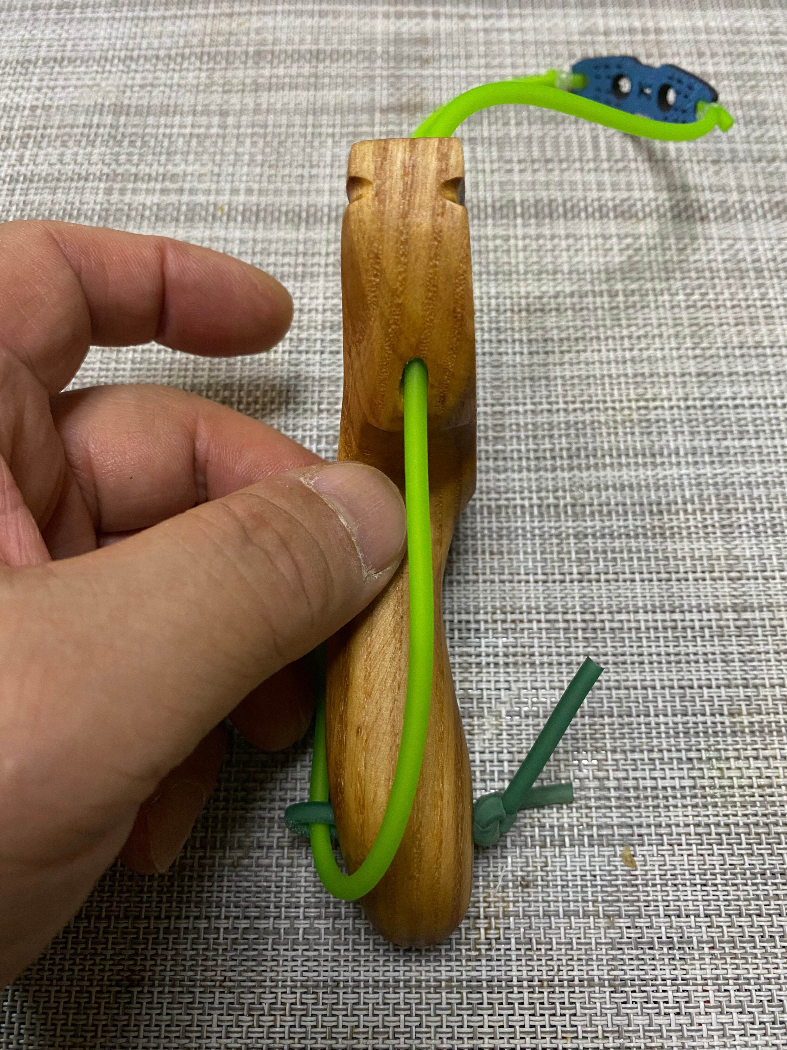 肘のところで小玉をゴム管に入れて固定することも可能で、射撃の精度をさらに高めます。写真ではお遊びでハンドルエンドの穴を利用してゴムを引き込んでおり、ヘッドから先の長さを短くして次の弾の装填をし易くしています。表に出ているゴム管は握るのに邪魔にならない所を通っています。