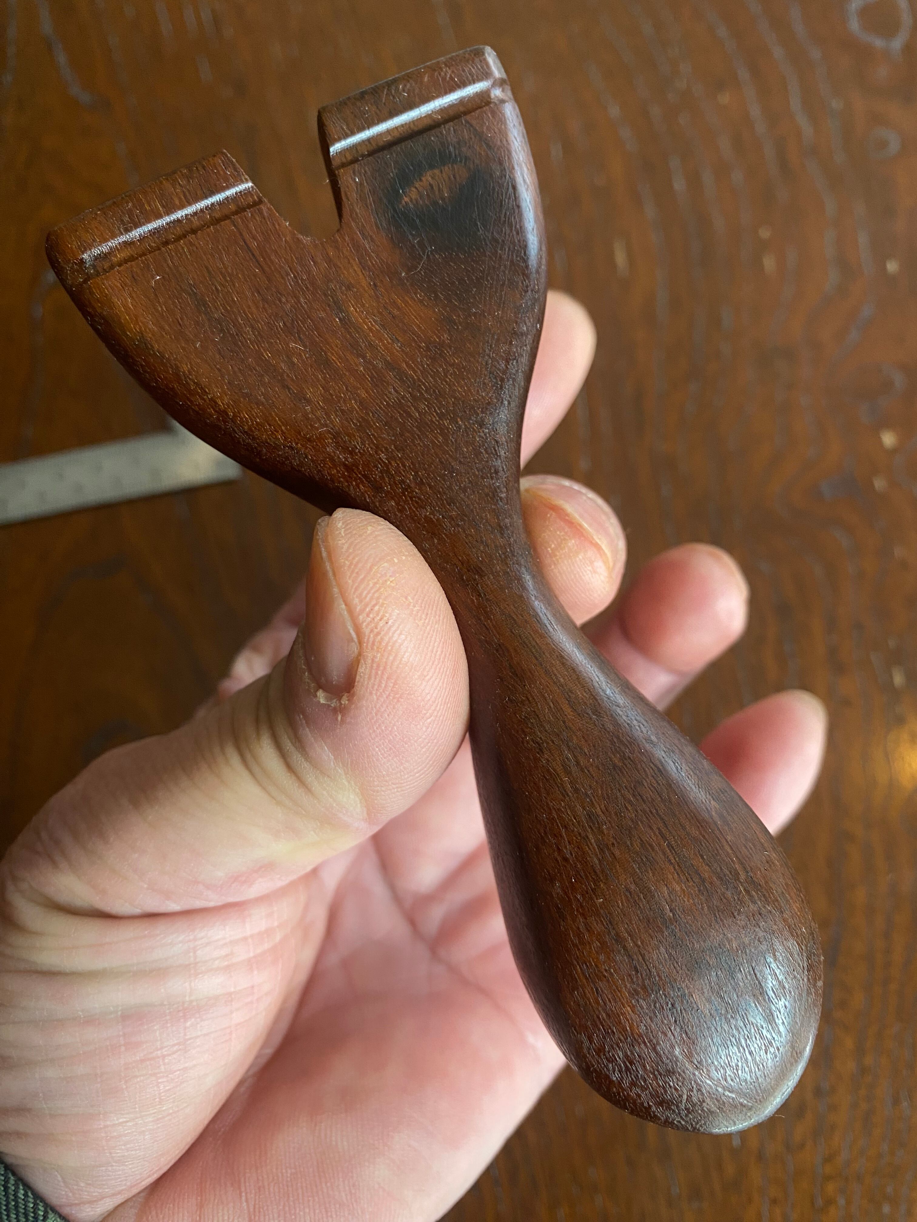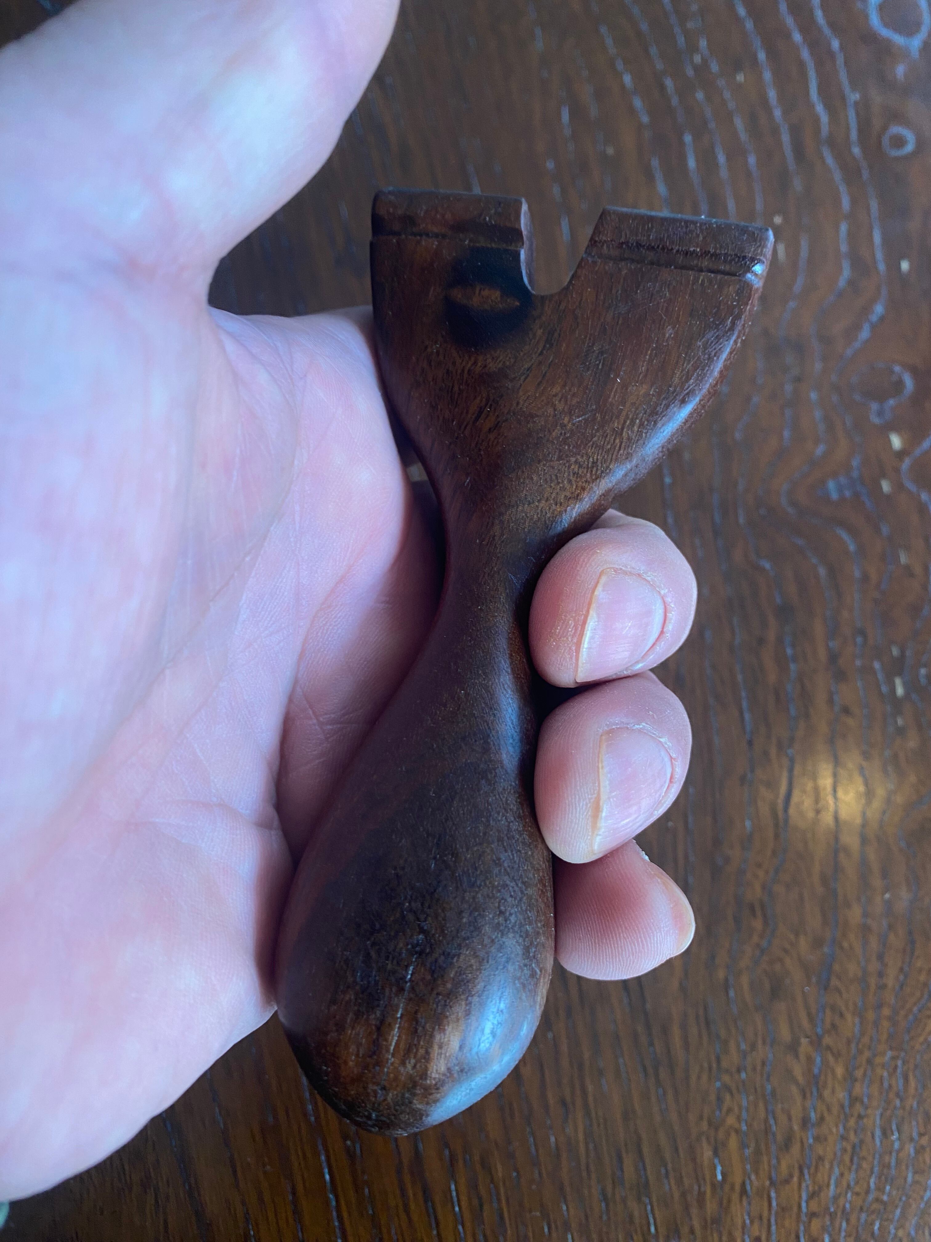 このモデルは、初めて試しに作ったスリングショットであり、素材が木であることがしっかりと感じられる仕上がりとなっています。節があったりハンドルのエンド部分に少しヒビがあるものの、それが逆に独特の風合いを与え、クラフト感を演出。しっかりとした握り心地が特徴で、安定した射撃を実現しており、射撃趣味の方からカジュアルなユーザーまで、多くの方にご満足いただけることでしょう。