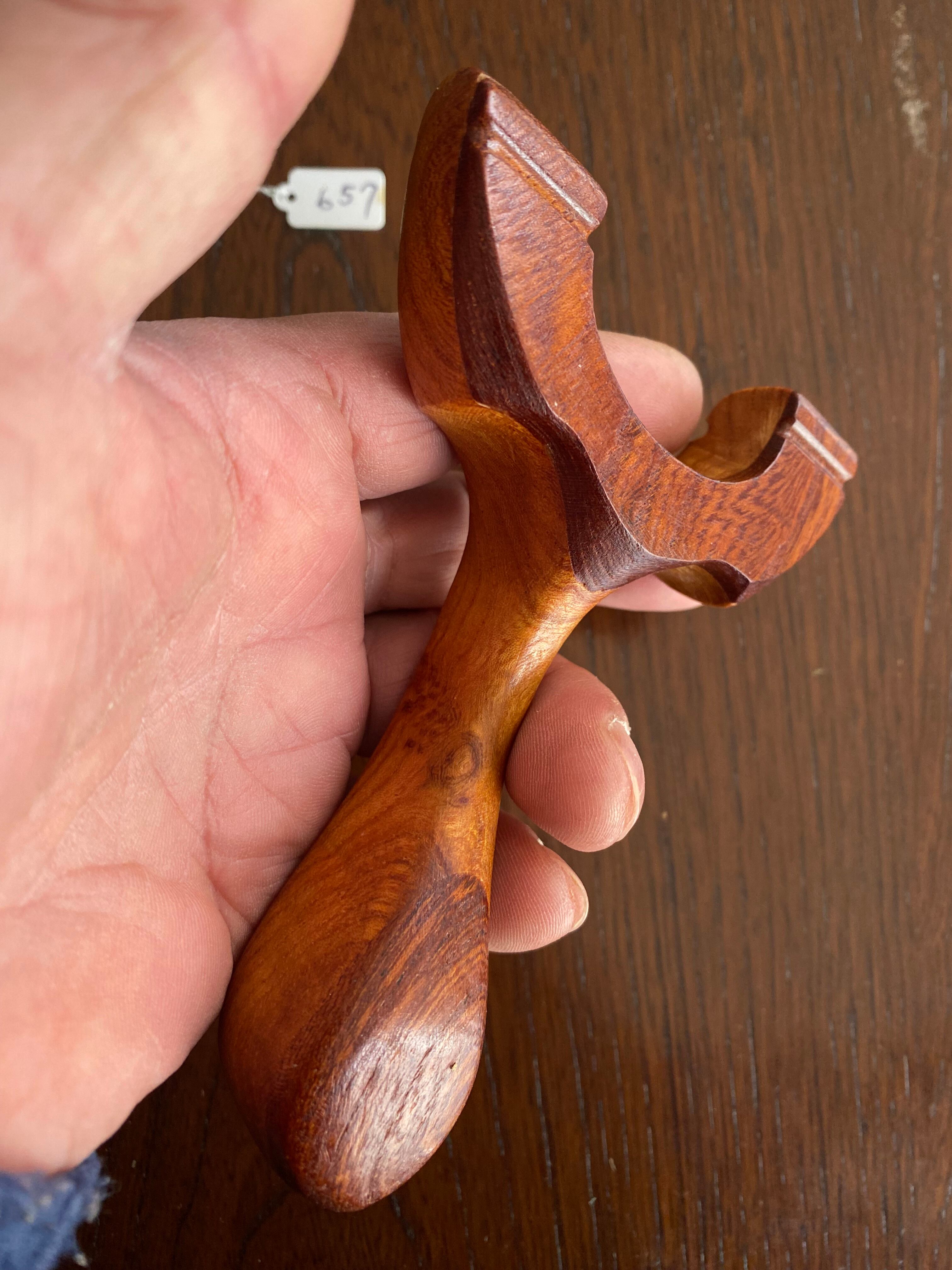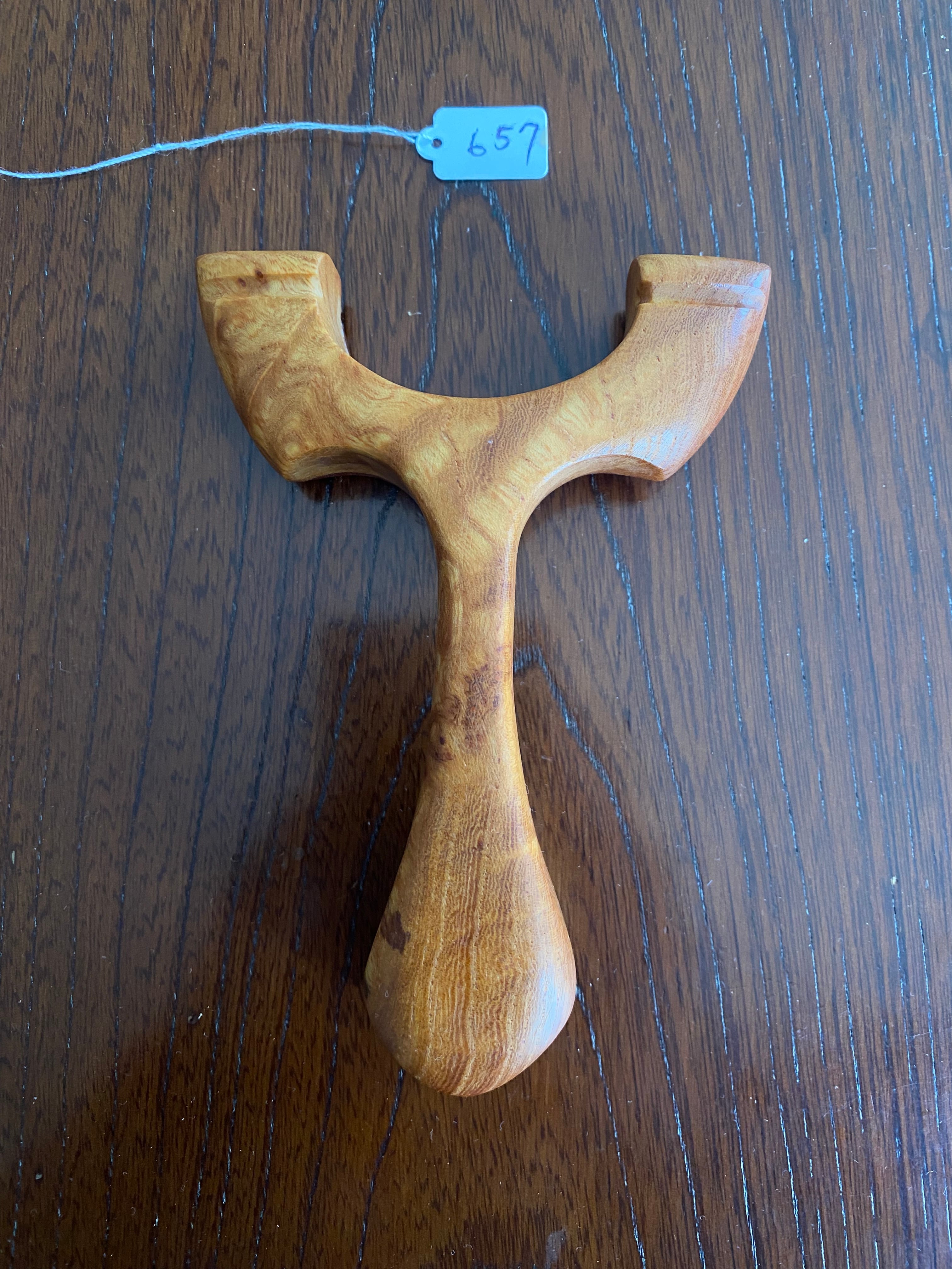 このモデルは、Wケヤキ製の特別なデザインが魅力です。表面には黄色っぽいケヤキ杢、裏面には赤ケヤキを使用し、まさに唯一無二の存在感を放っています。同じ杢目はなく、手にするたびに特別な感覚を味わえるスリングショットです。しっかりと握れる形状が特徴で、快適な使用感を提供します。
