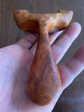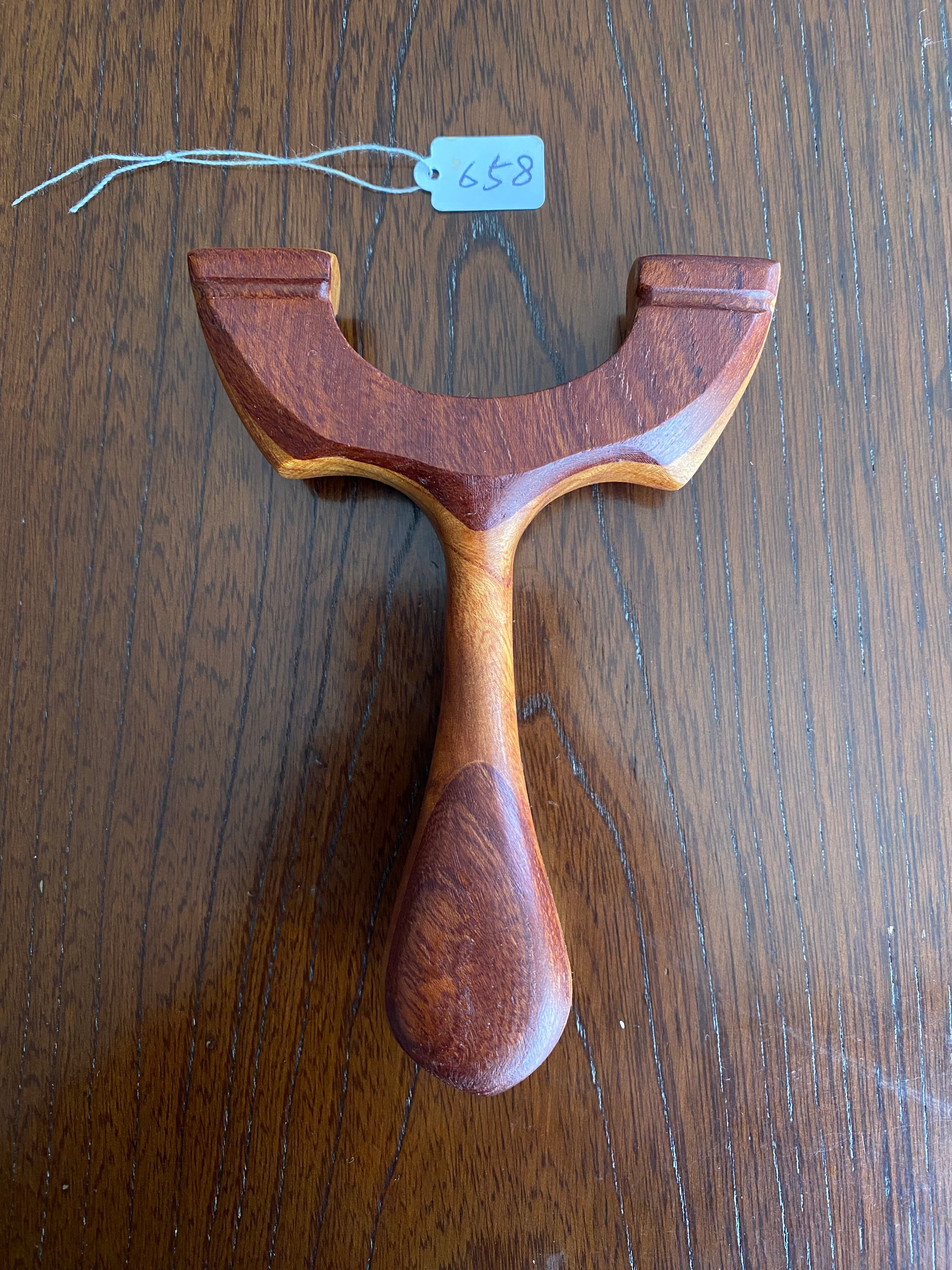 このモデルは、Wケヤキ製の特別なデザインが魅力です。表面には黄色っぽいケヤキ杢、裏面には赤ケヤキを使用し、まさに唯一無二の存在感を放っています。同じ杢目はなく、手にするたびに特別な感覚を味わえるスリングショットです。しっかりと握れる形状が特徴で、快適な使用感を提供します。